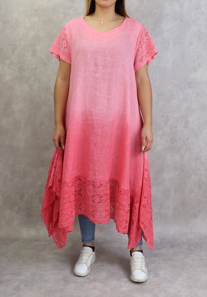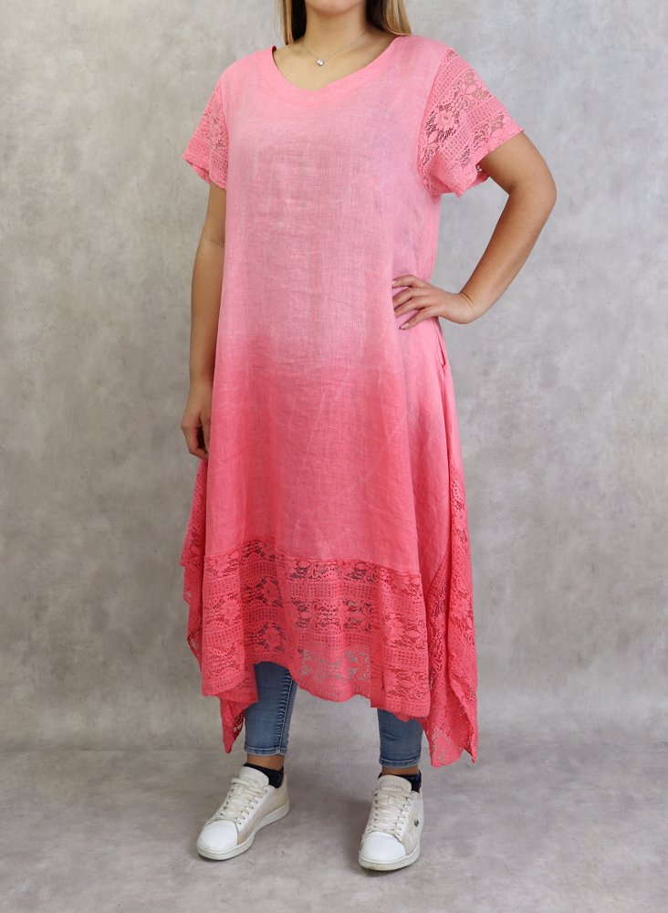 Tunique longue, col dégagé, manches courtes à dentelle ainsi que sur le bas, poches latérales. Coupe évasée, tissu fluide et léger mélange lin /coton agréable en toute saison.