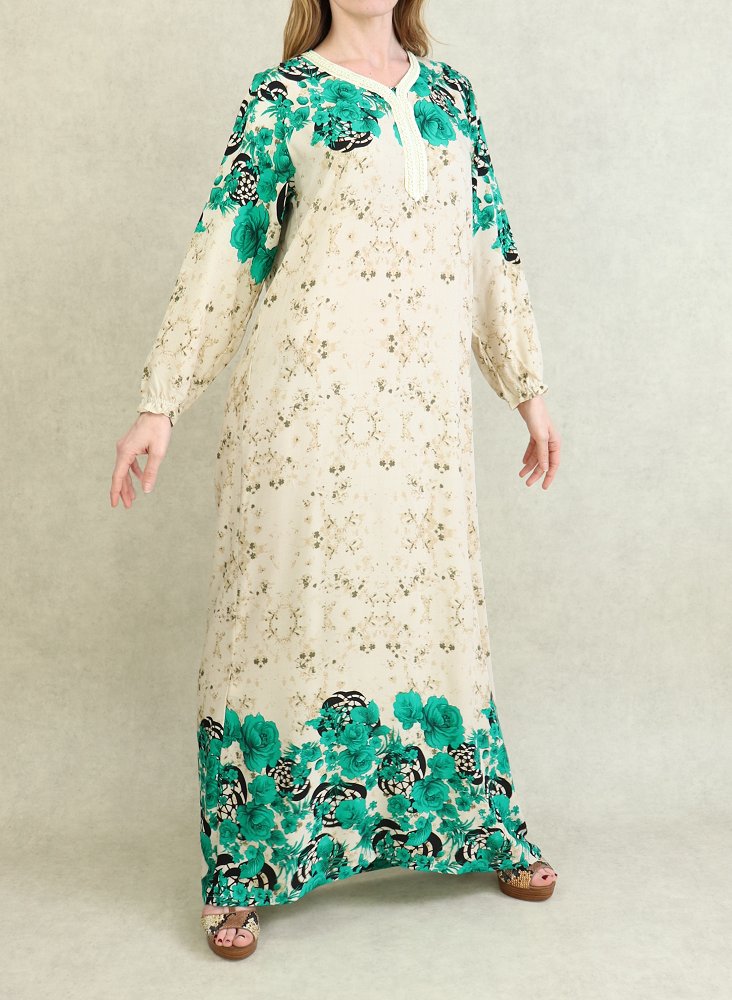 Robe d’intérieur avec motifs à fleurs sur fond beige. Col V avec broderies sur l'avant, manches longues finition élastiques aux poignets.