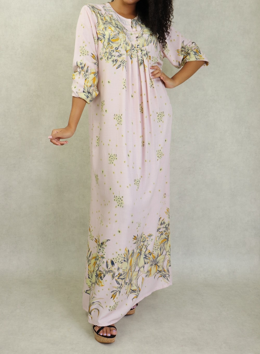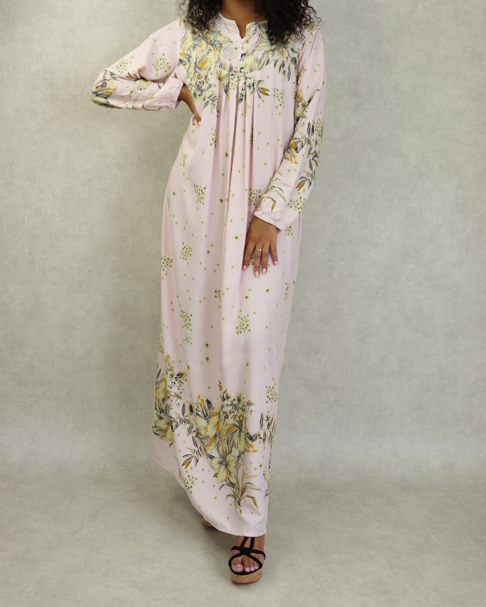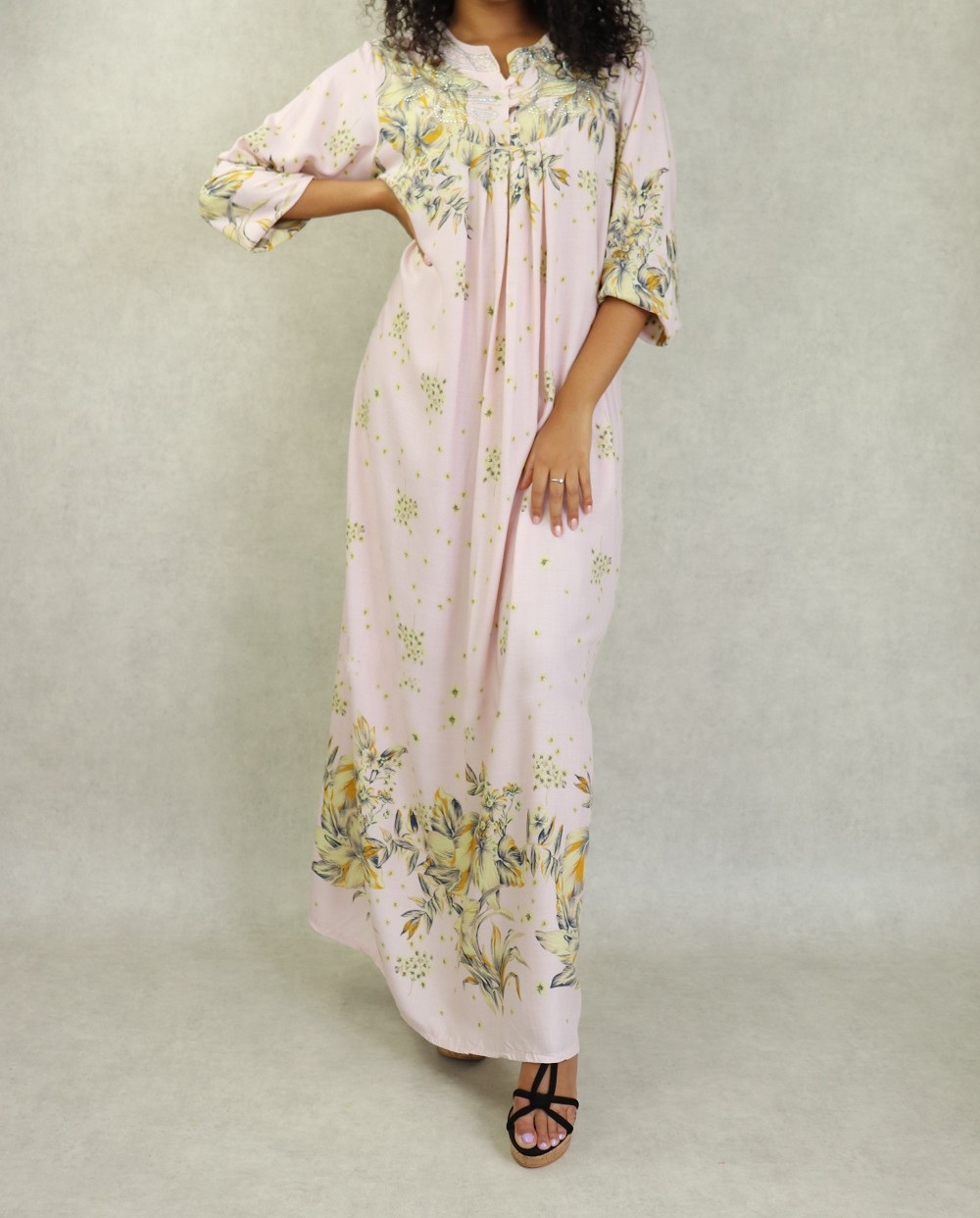Robe d'intérieur 100% coton (gandoura) manches longues motifs fleurs pour femme sur un fond Rose poudrée Vetement & Accessoire