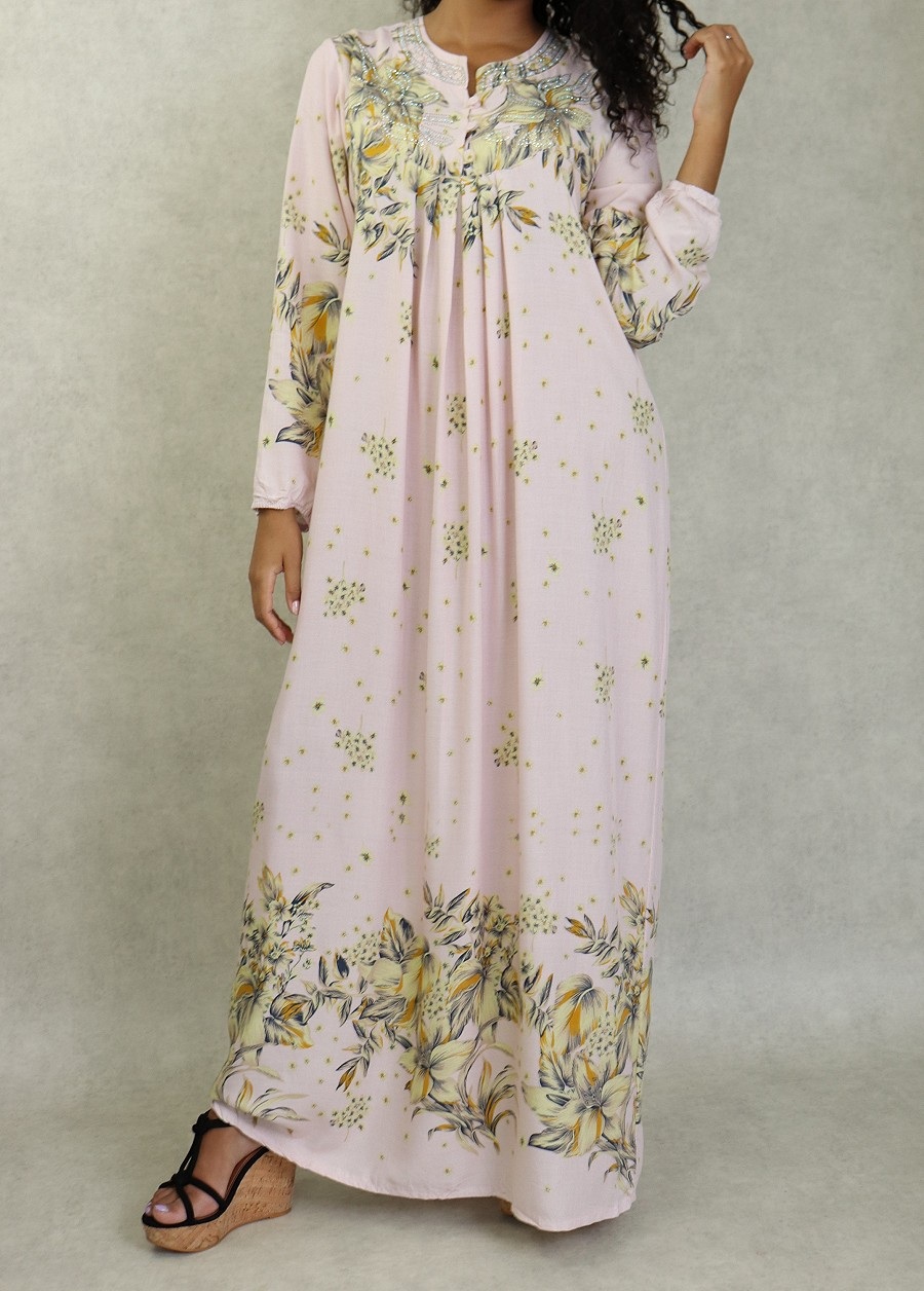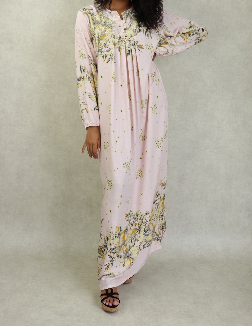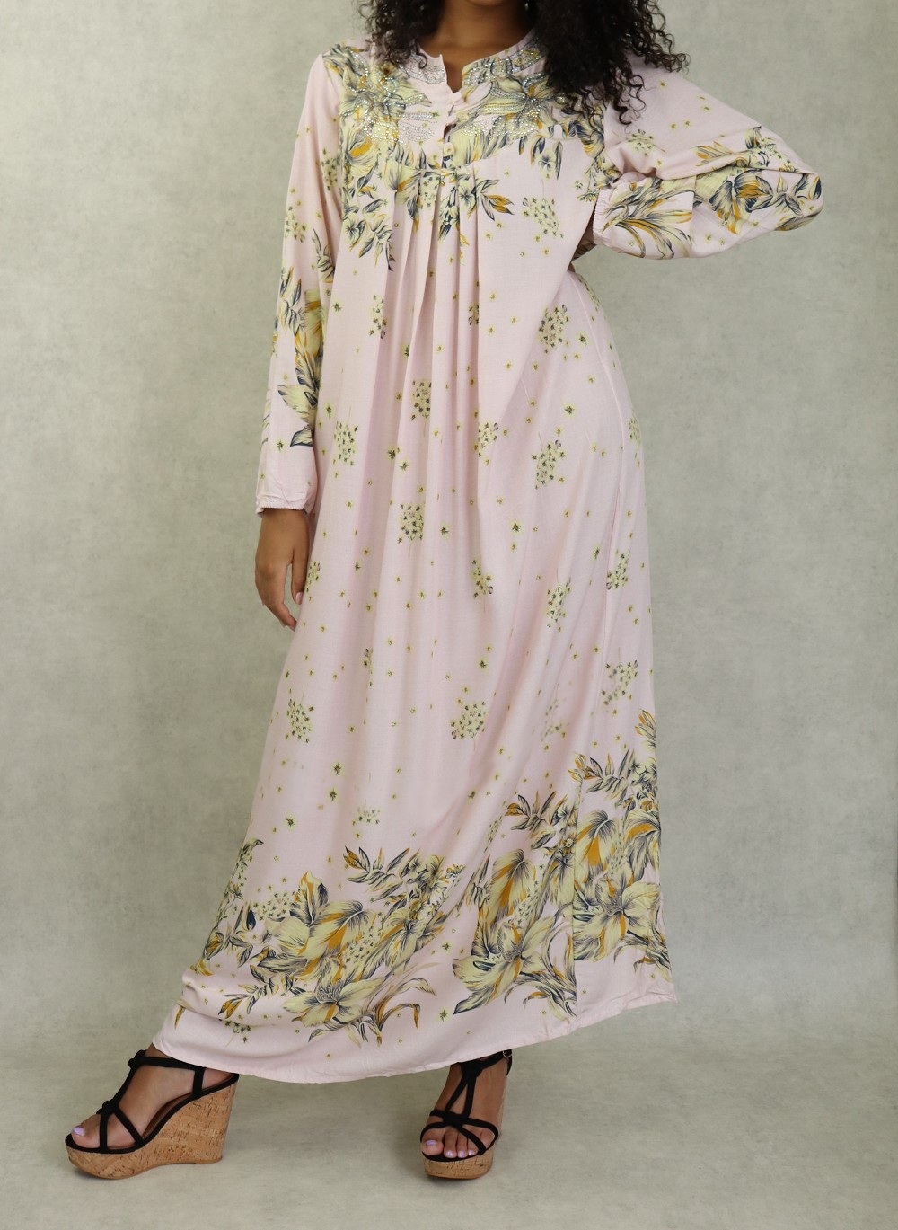 Robe d'intérieur 100% coton (gandoura) manches longues motifs fleurs pour femme sur un fond Rose poudrée Vetement & Accessoire