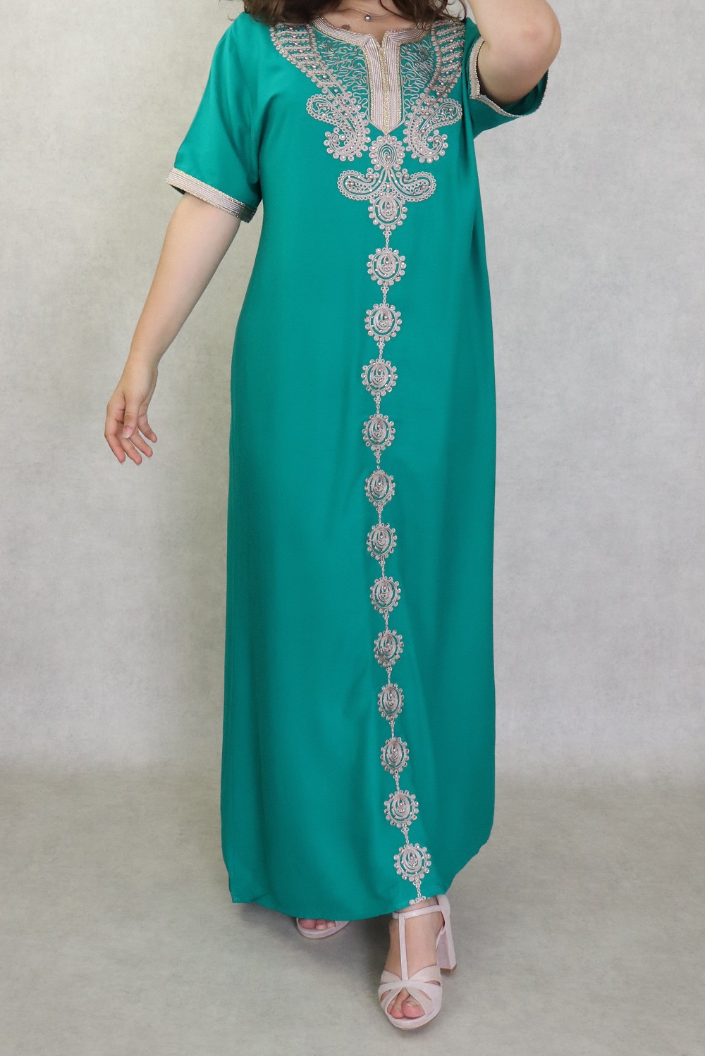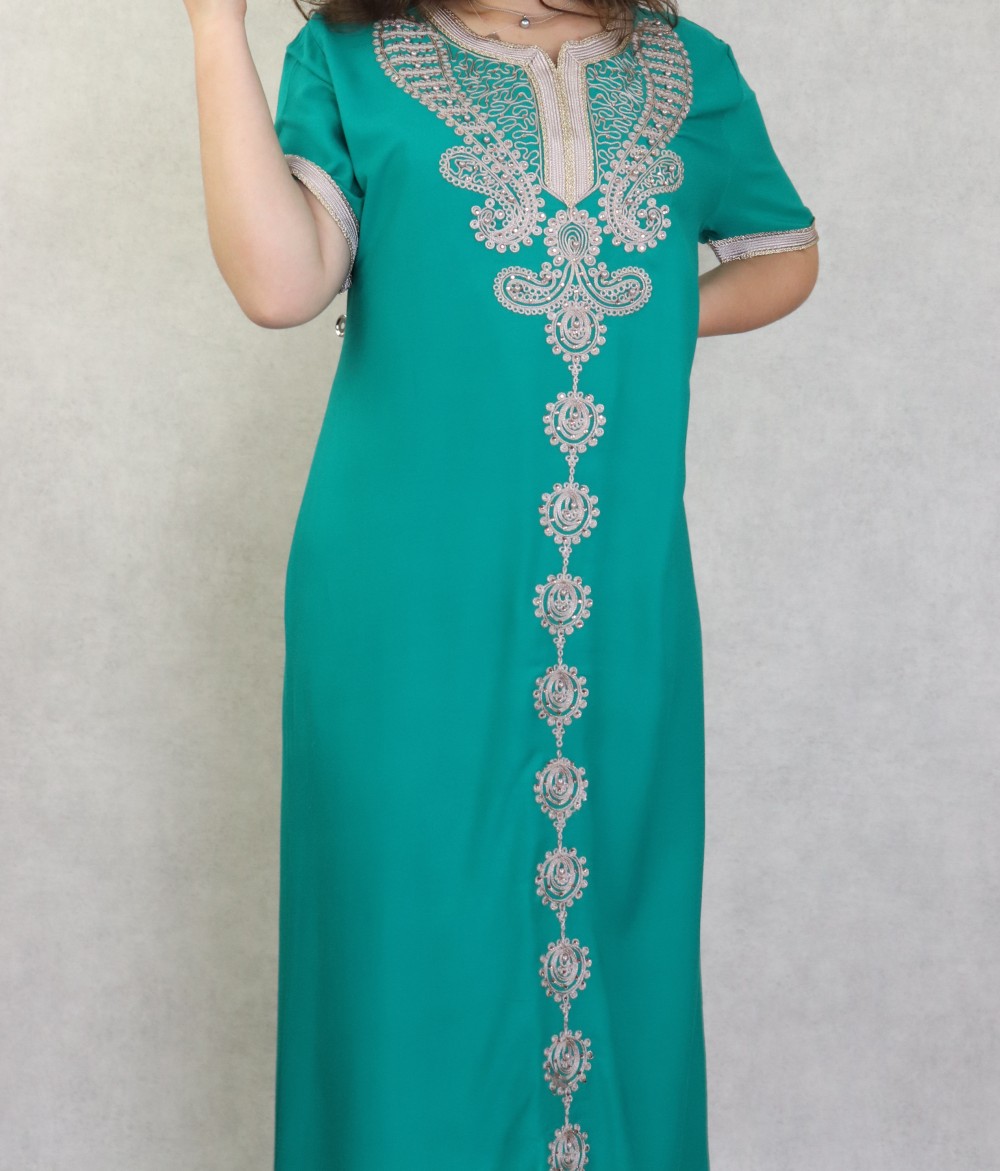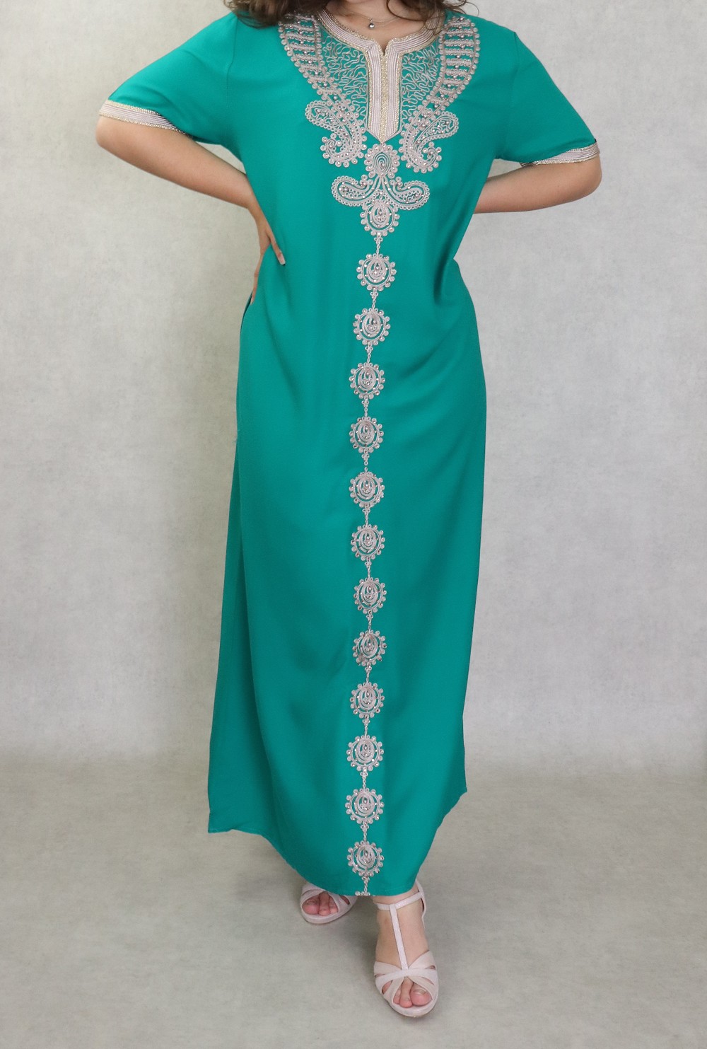 Robe d'interieur brodee manches courtes avec perles - Couleur Vert emeraude