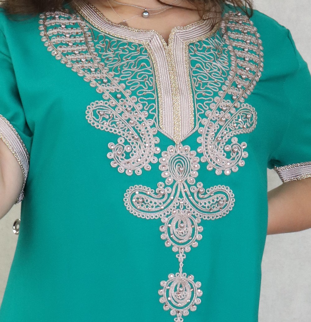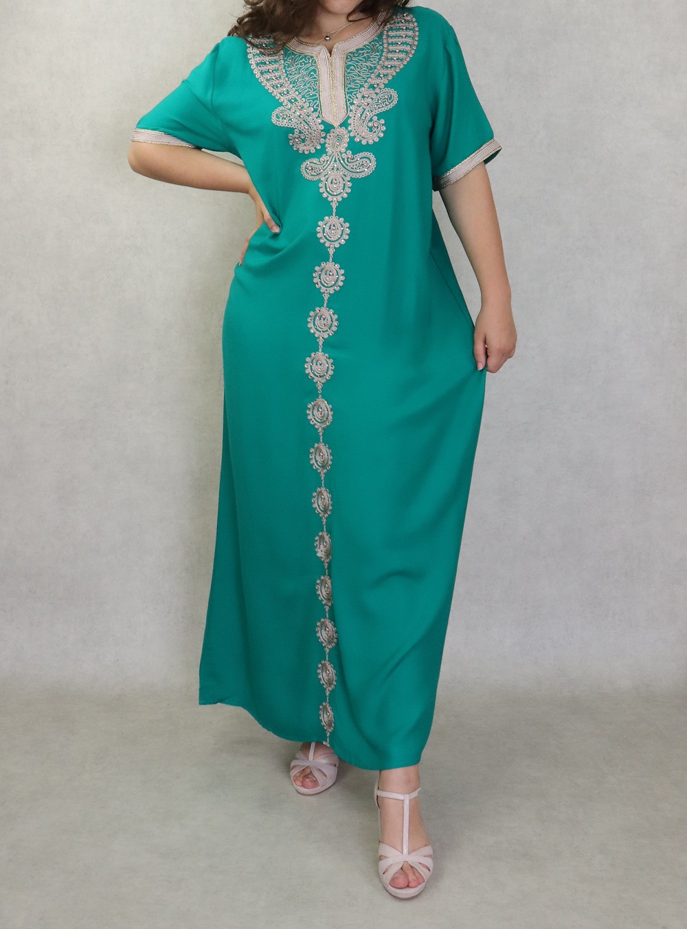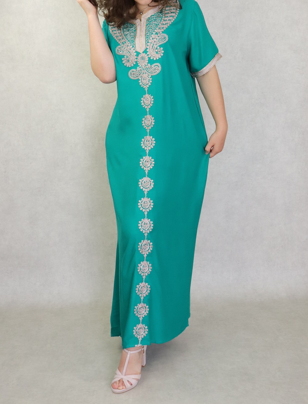 Robe d'interieur brodee manches courtes avec perles - Couleur Vert emeraude