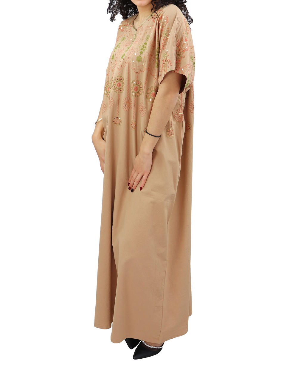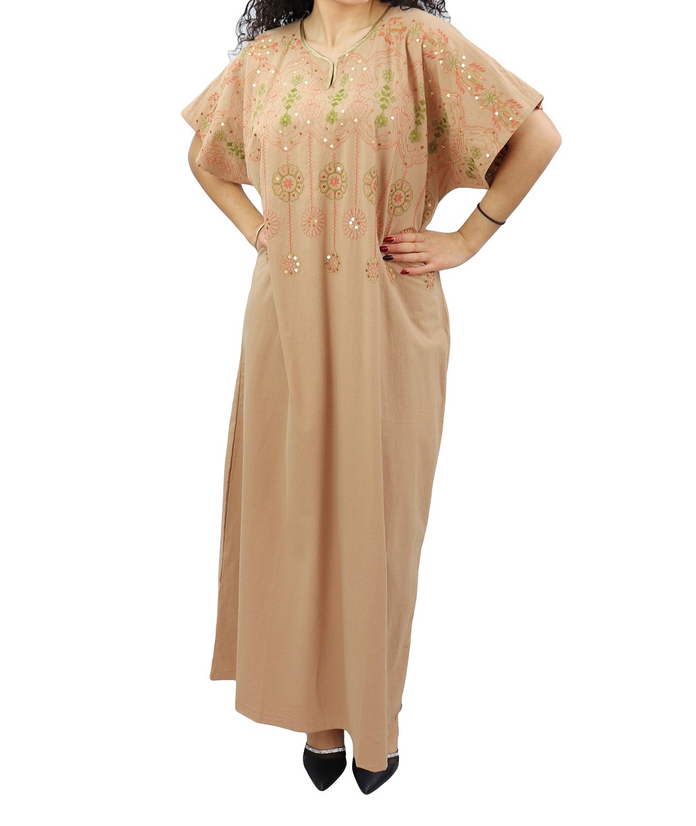 Robe d'intérieur agréable à porter avec broderies en plusieurs couleurs et paillettes sur le devant et le dos. Tissu doux très agréable à porter. Manches courtes.