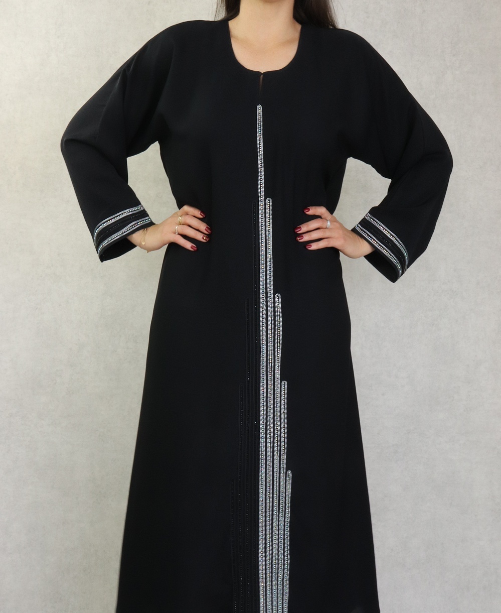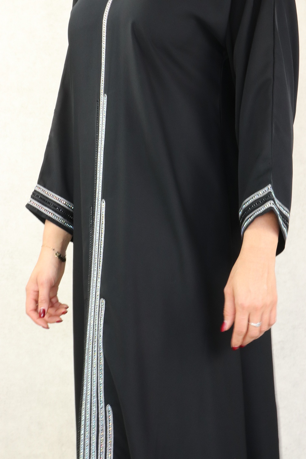 Robe Abaya Dubaï noire de qualité avec bande brodée et strass et perles argentées - REF. 38189 (45.00 €)