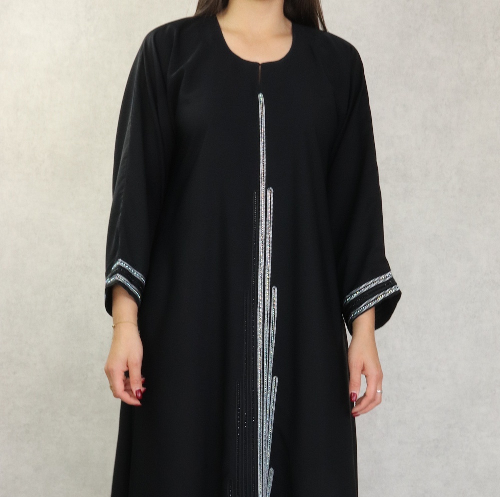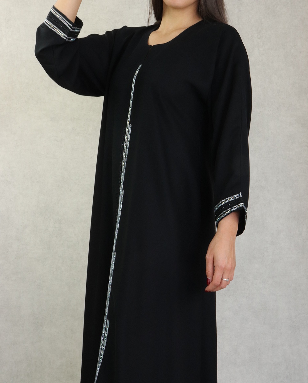 Robe Abaya Dubaï noire de qualité avec bande brodée et strass idéale pour la fête de l'Aïd 2025 - REF. 38128 (45.00 €)