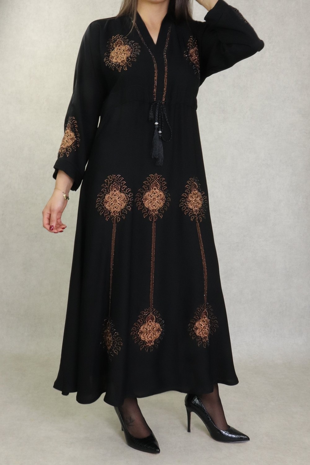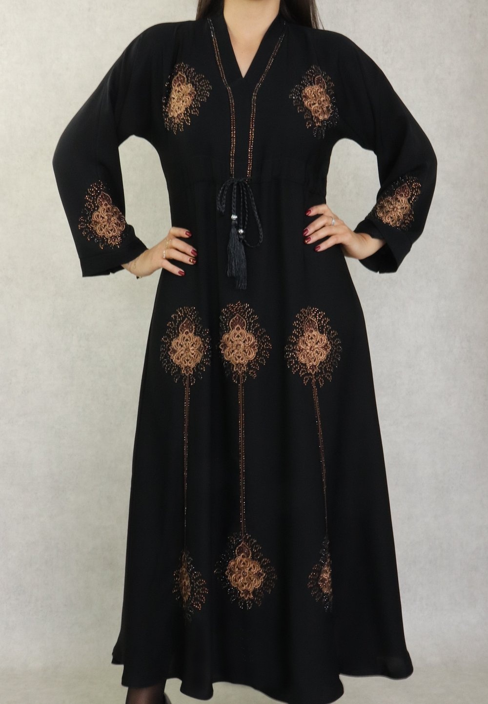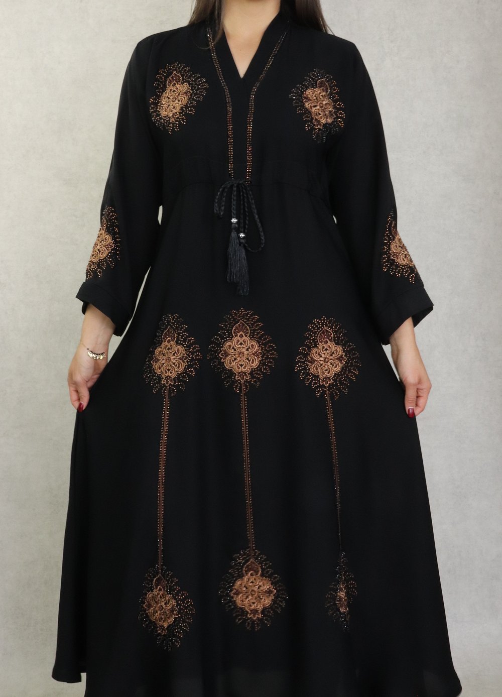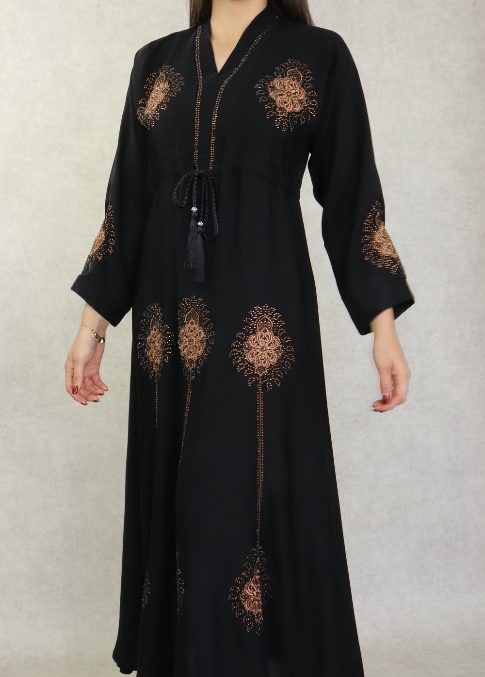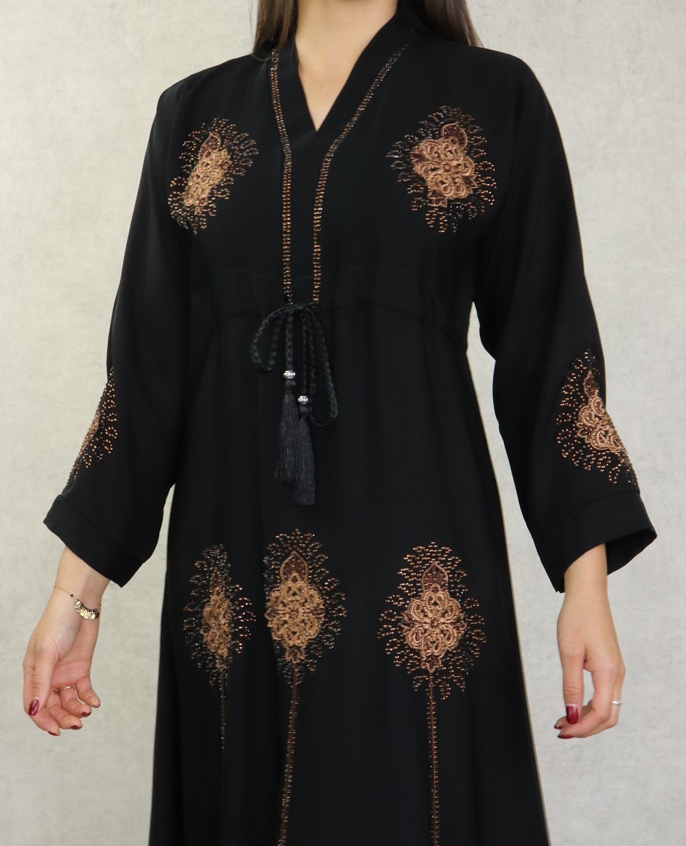 Abaya Dubai de couleur noir fournie avec son châle assorti. Ceinture de serrage interne.