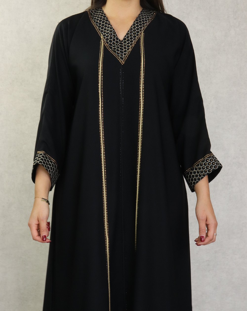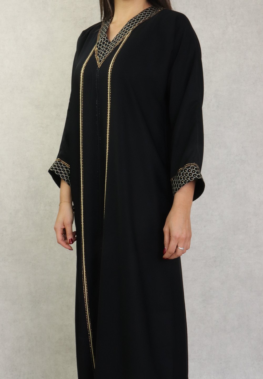 Robe Abaya Dubaï de qualité avec motifs strass dorés sur le devant et les manches - Couleur noir - REF. 38179 (39.90 €)
