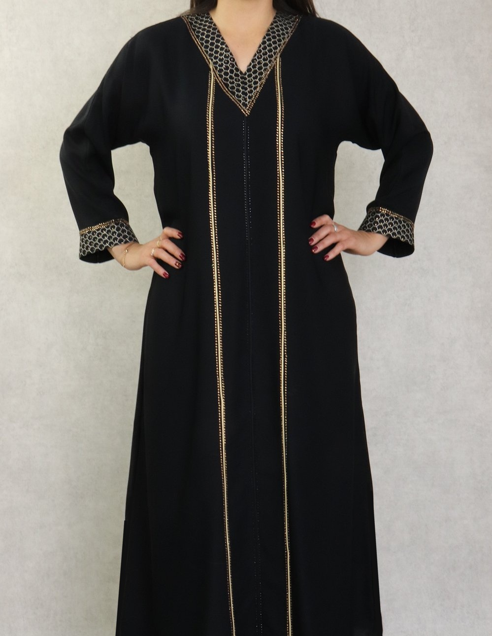 Robe de soirée Abaya Dubaï noire de qualité avec broderie et strass dorés - REF. 38188 (45.00 €)
