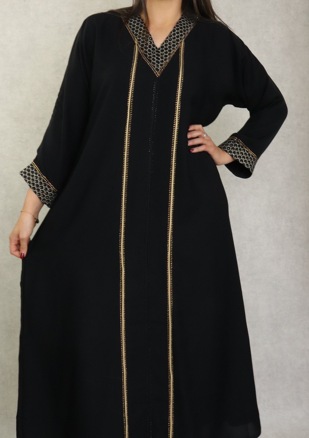Robe Abaya Dubaï noire de qualité avec bande brodée et strass idéale pour la fête de l'Aïd 2025 - REF. 38128 (45.00 €)