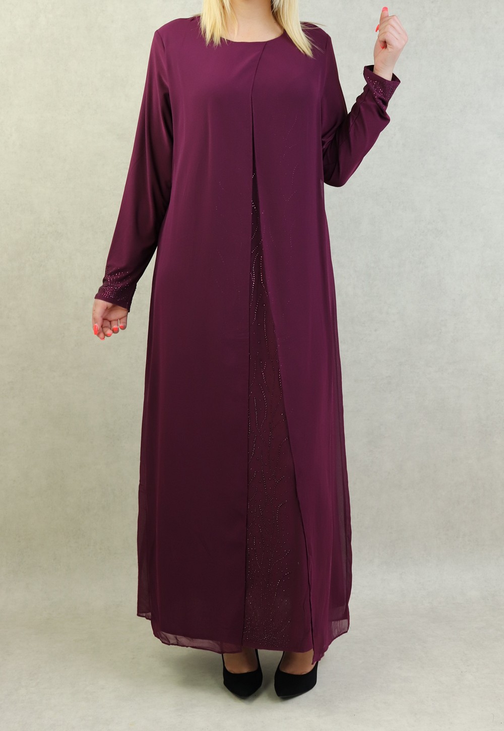 Robe longue bi-matière fluide pour femme (Vetement moderne musulmane) - Couleur aubergine - REF. 32517 (25.00 €) - En Promotion à 19.00 €