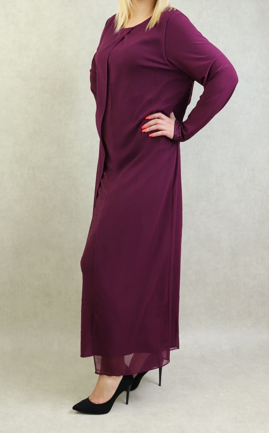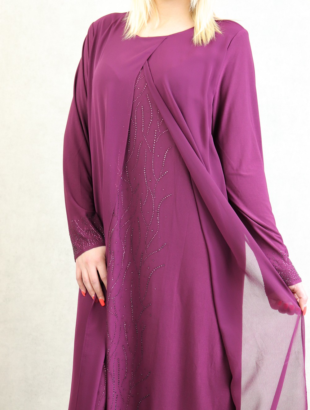 Robe longue pour femme avec broderies sur le devant et les manches - Couleur prune
