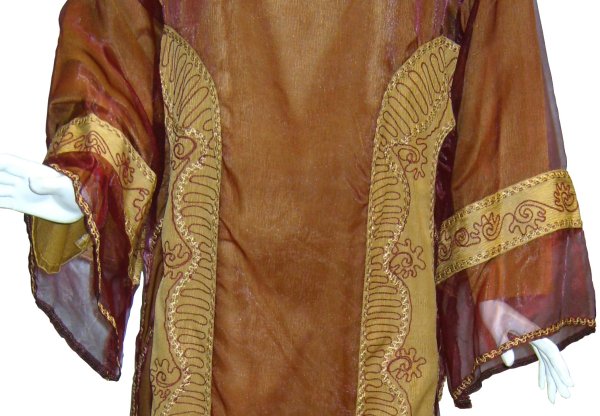 obe de soirée Jamila marron en organza doublée, avec broderies sur le col, les deux côtés du devant et les manches.
