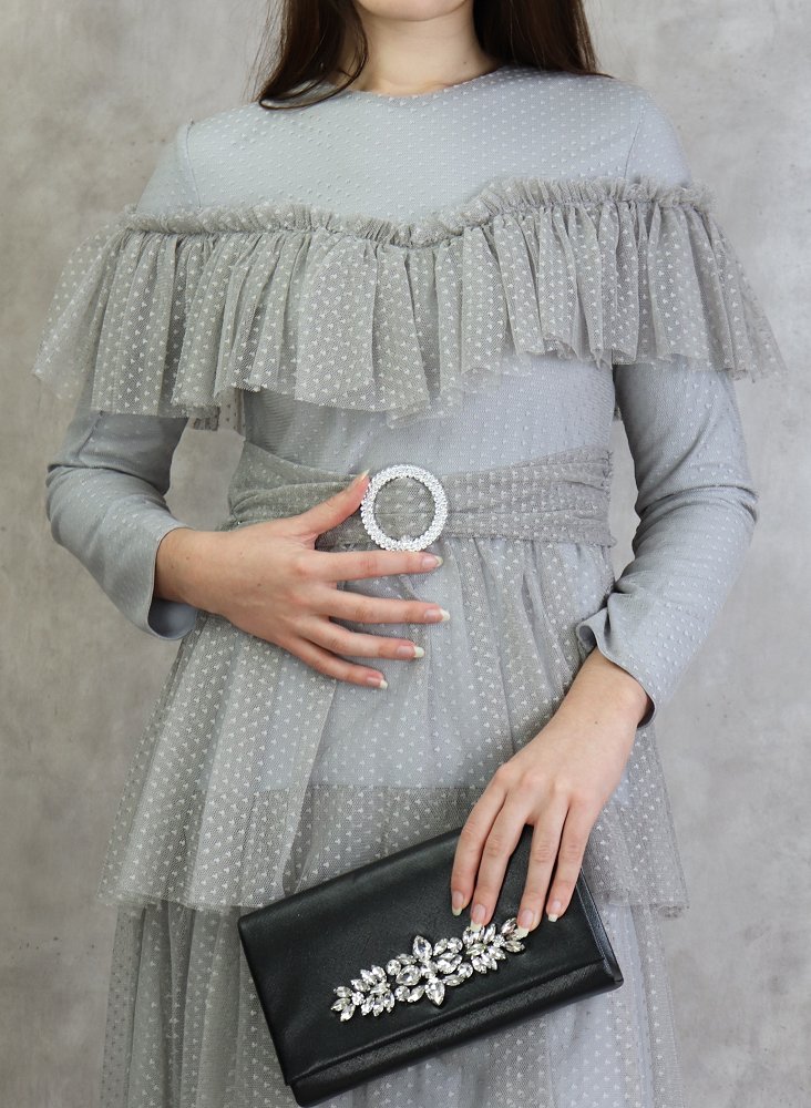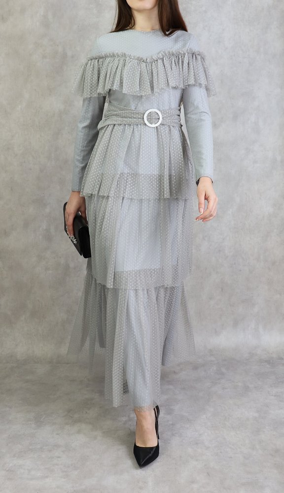 Robe longue, col rond, taille élastique, ceinture d'ornement en strass, fermeture glissière au dos, entièrement doublée, tissu extérieur effet tulle avec volants.