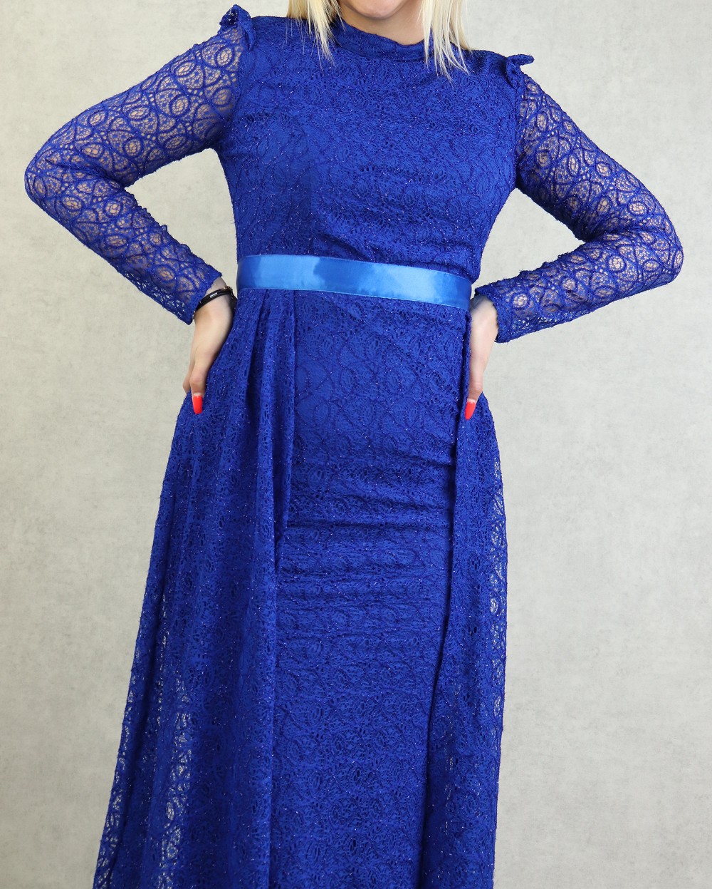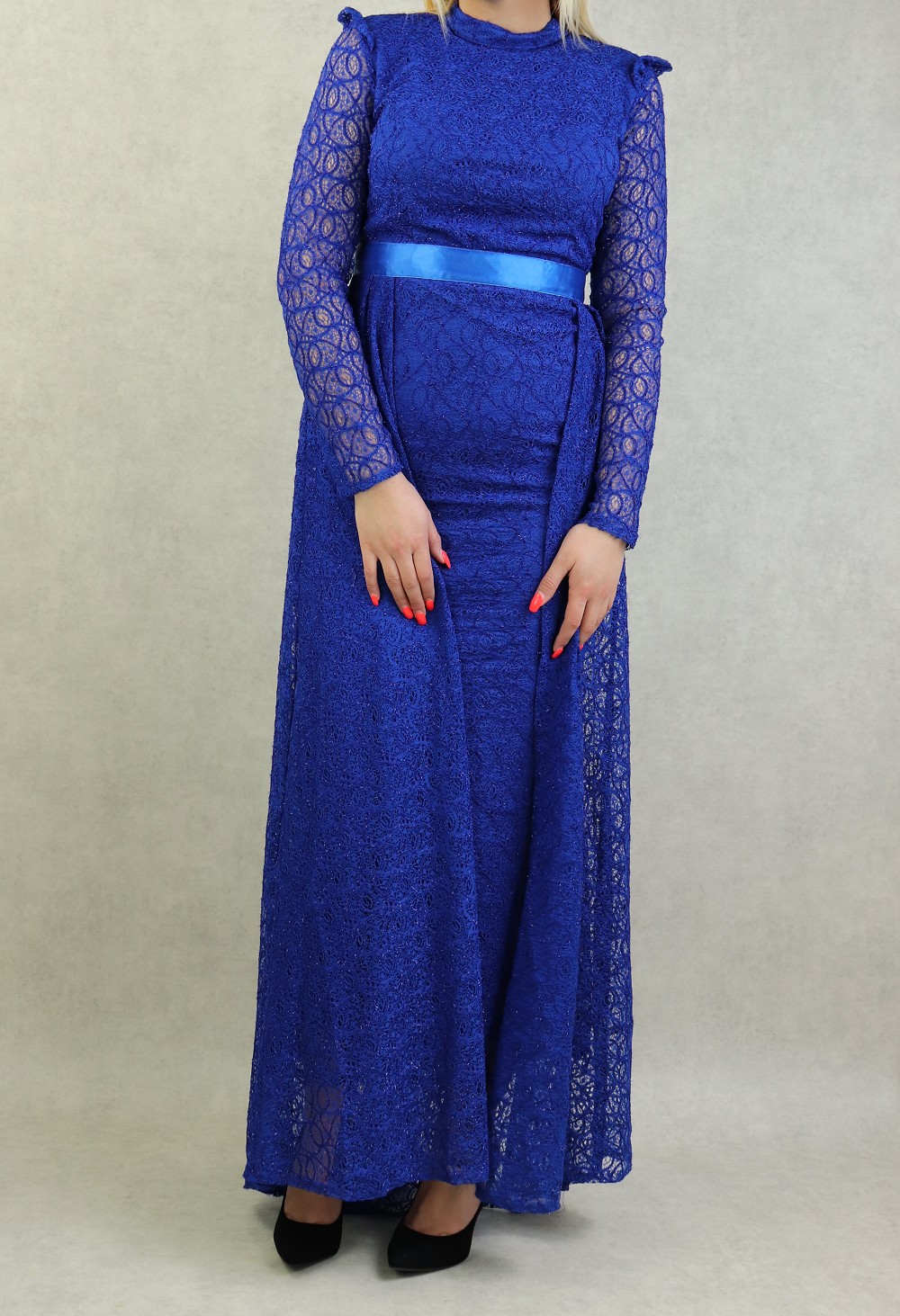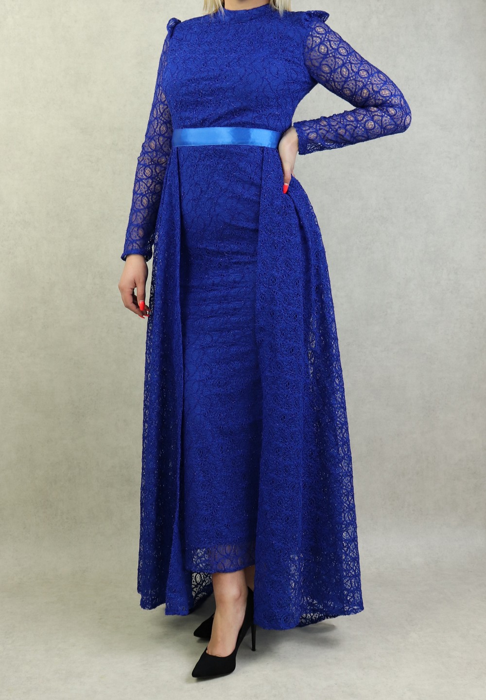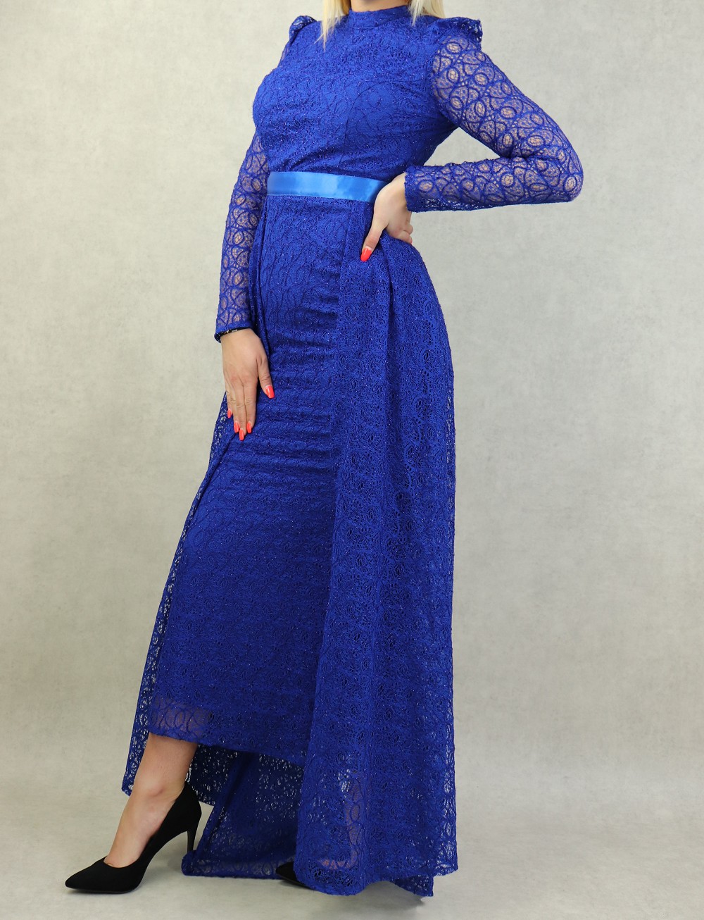 Robe de soiree maxi-longue avec traine en dentelle et collier assorti - Couleur Bleu Roi Marque Amelis Paris