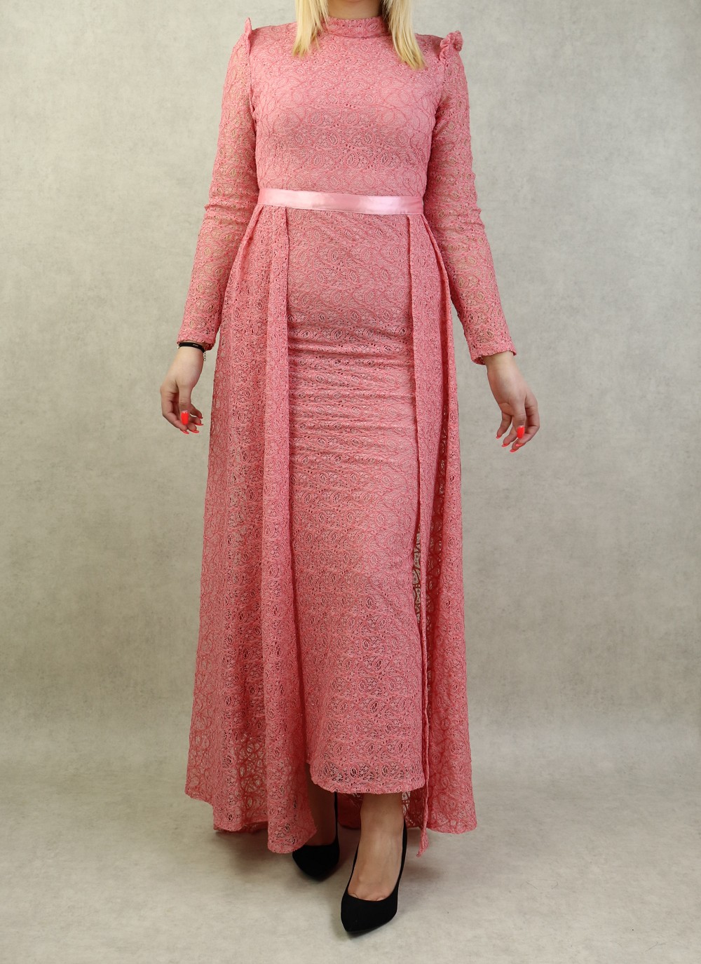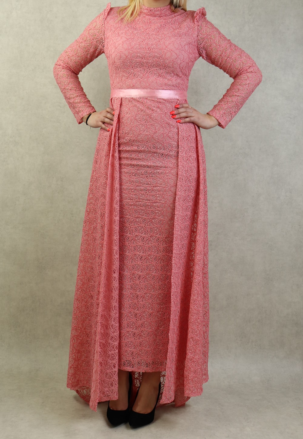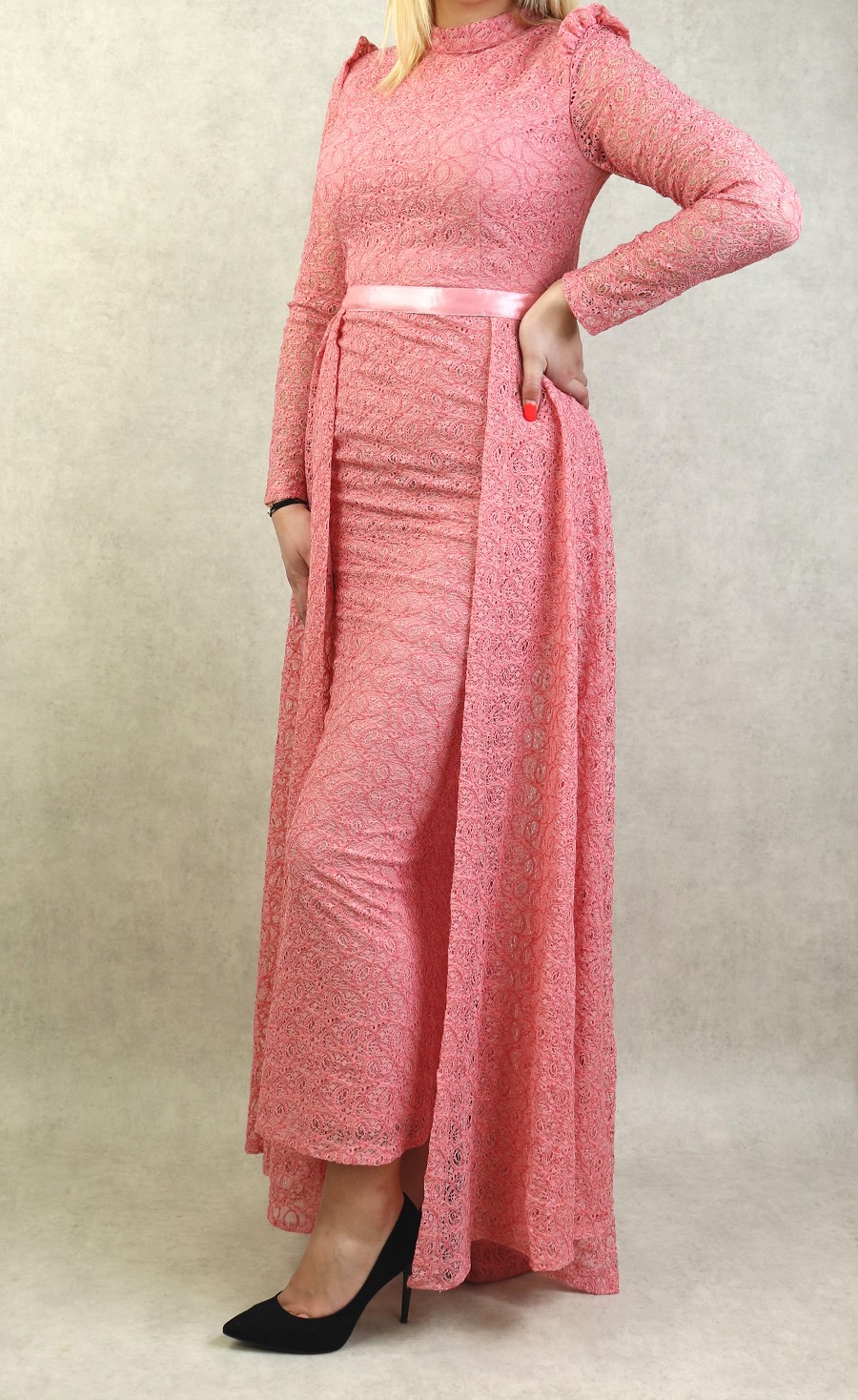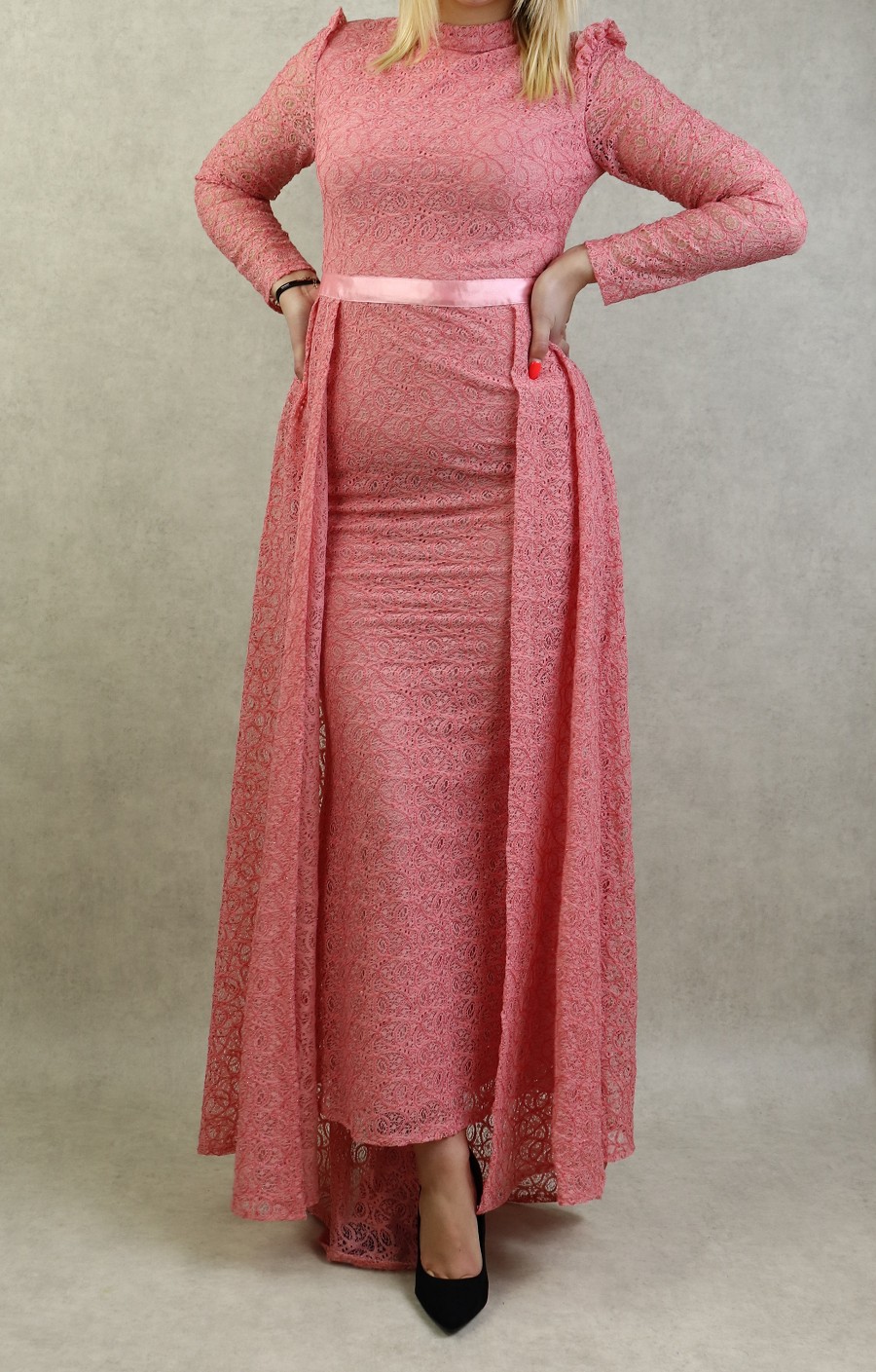 Robe de soirée maxi-longue avec traîne en dentelle et collier assorti - Couleur Rose Marque Amelis Paris Vetement & Accessoire