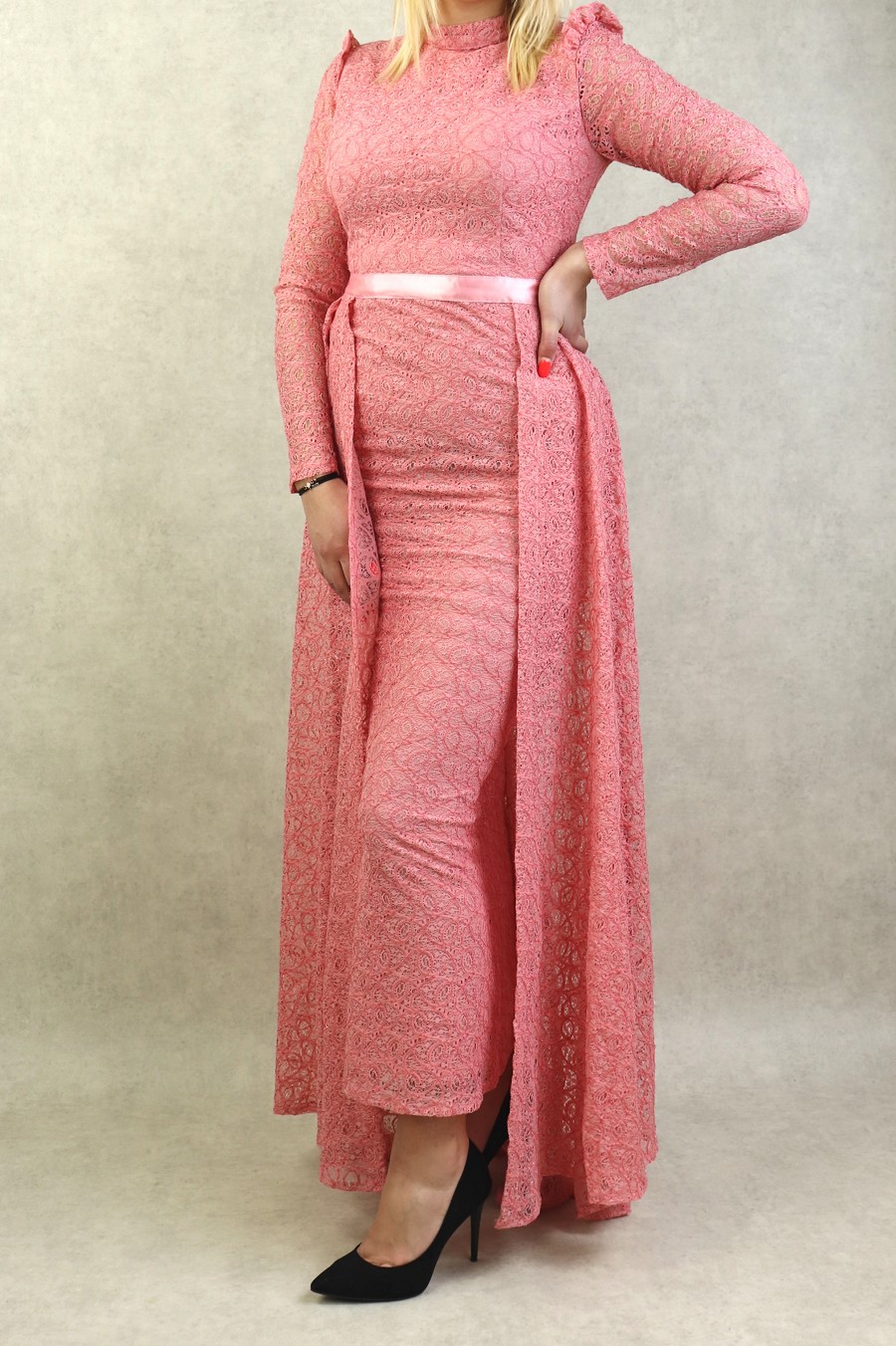 Robe de soiree maxi-longue avec traine en dentelle et collier assorti - Couleur Rose Marque Amelis Paris