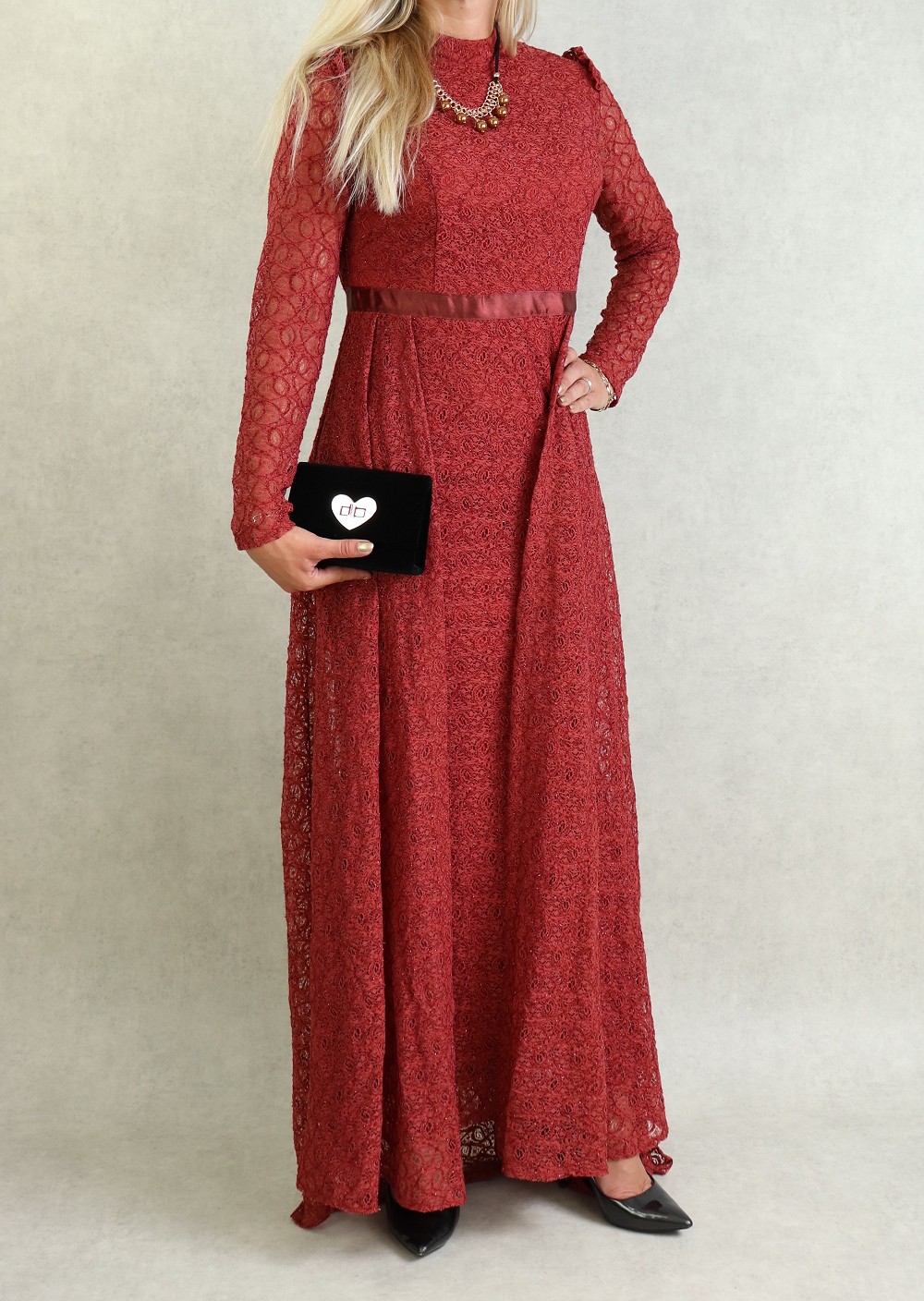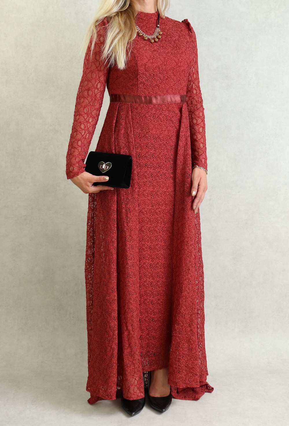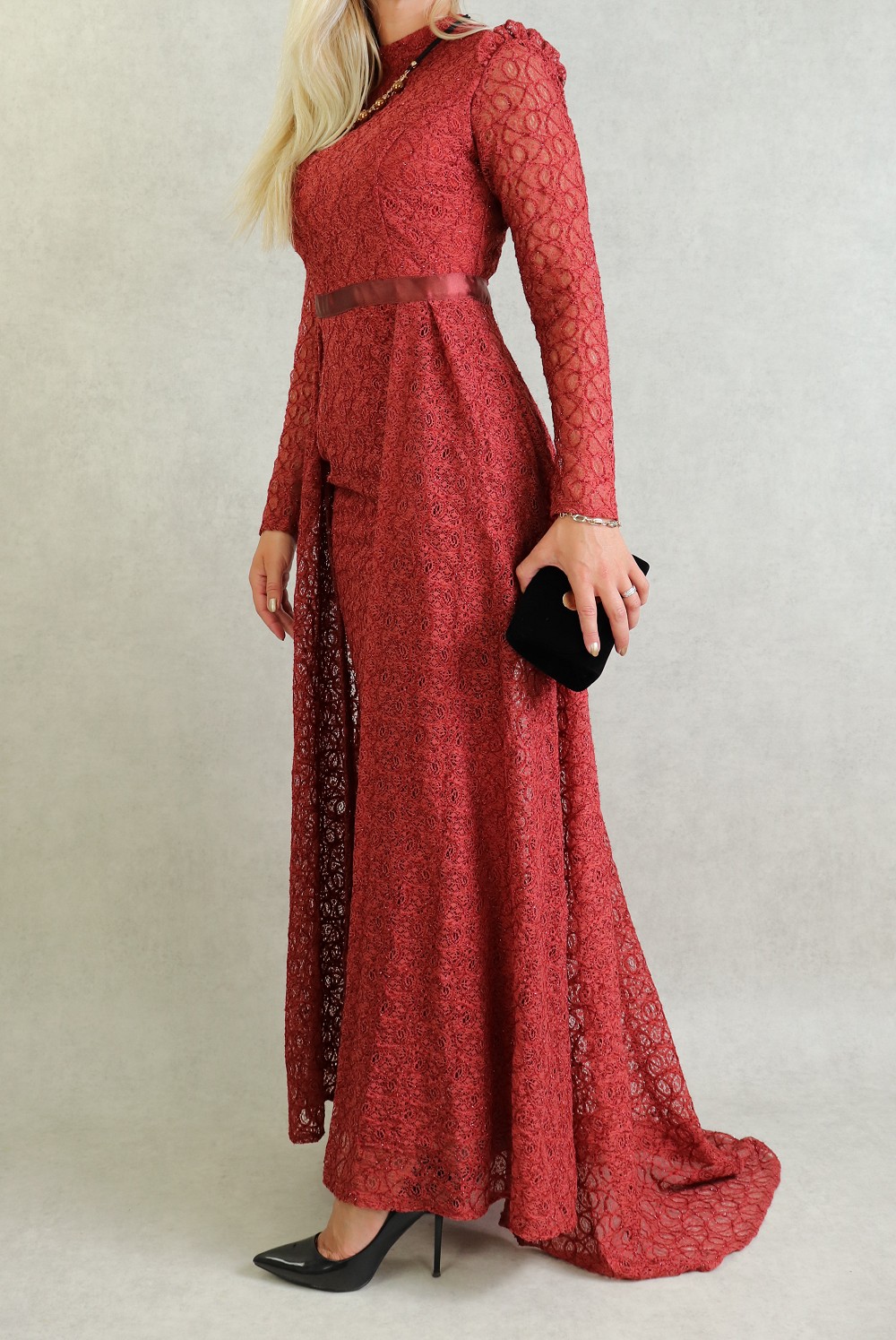 Robe de soiree maxi-longue avec traine en dentelle et collier assorti - Couleur Rouille Marque Amelis Paris