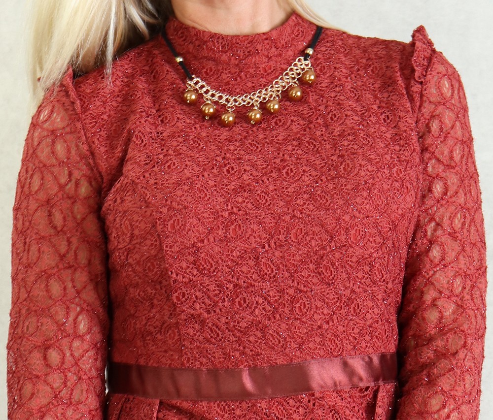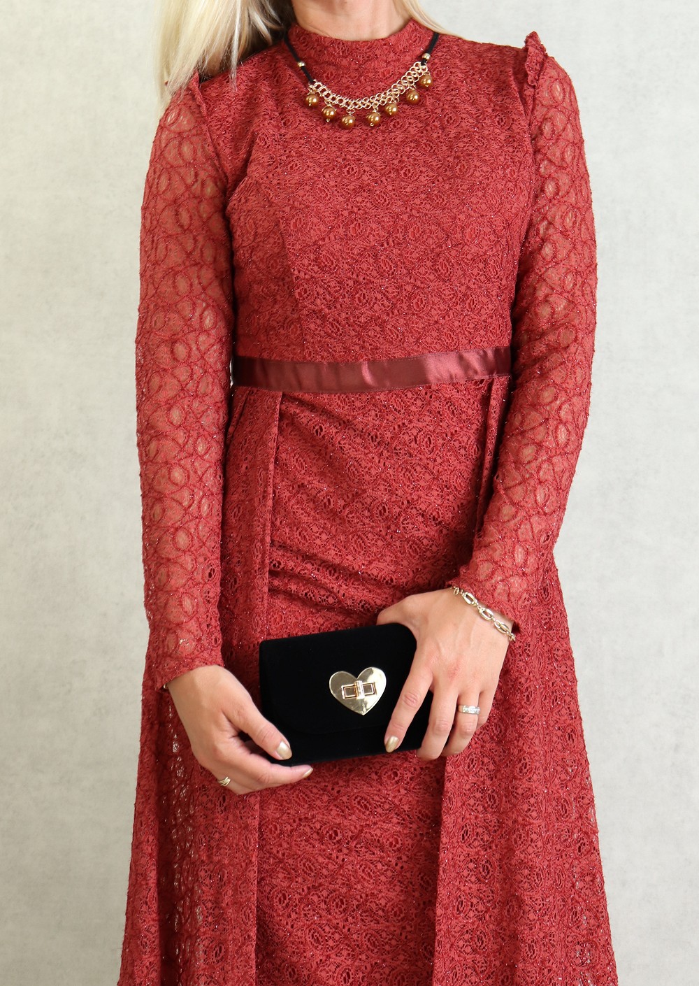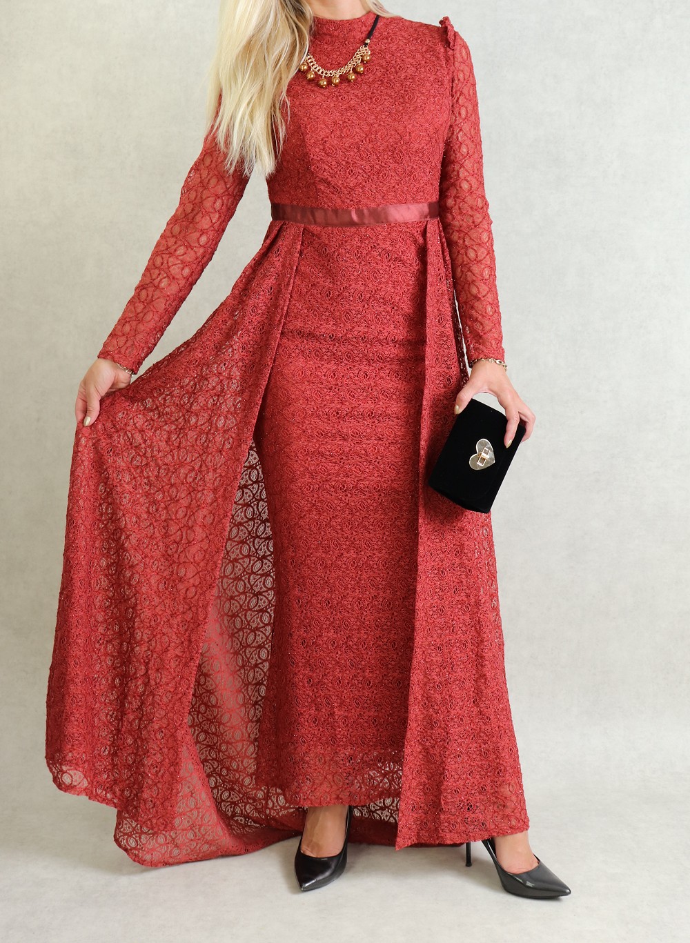 Robe de soirée maxi-longue avec traîne en dentelle et collier assorti - Couleur Rouille Marque Amelis Paris Vetement & Accessoire