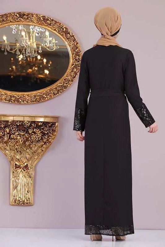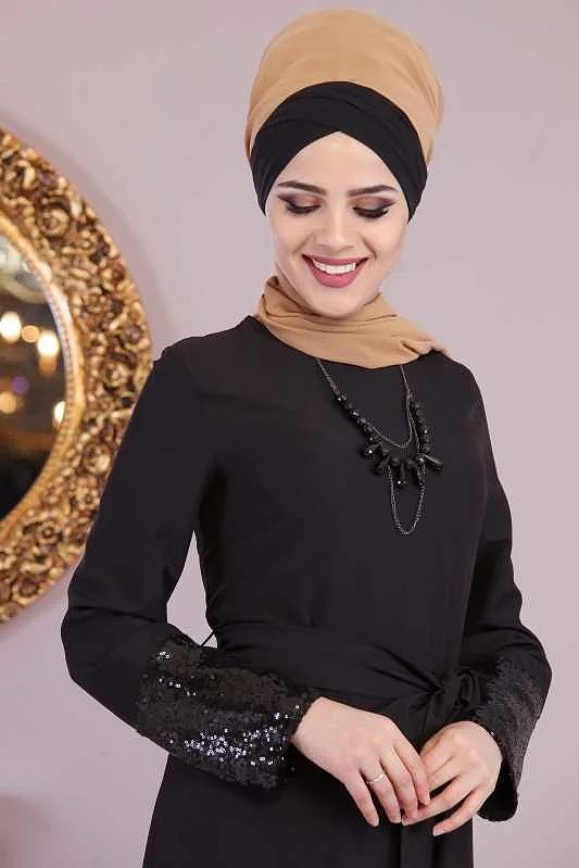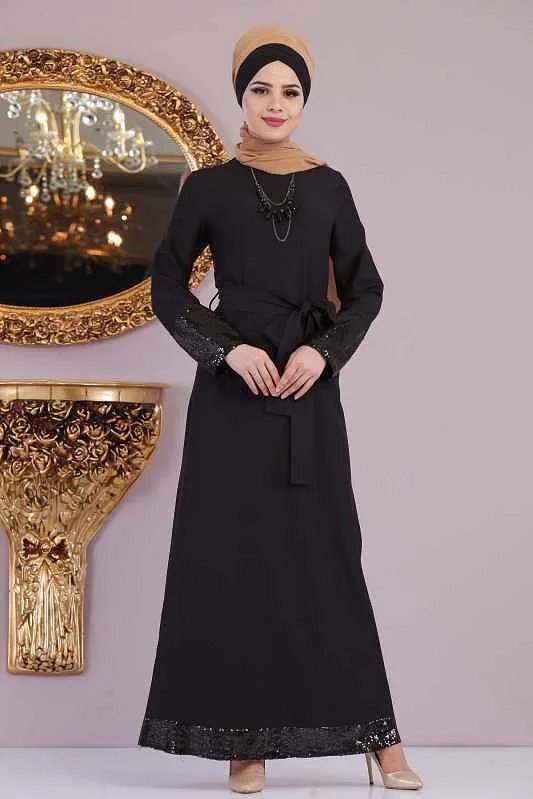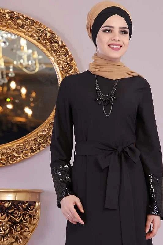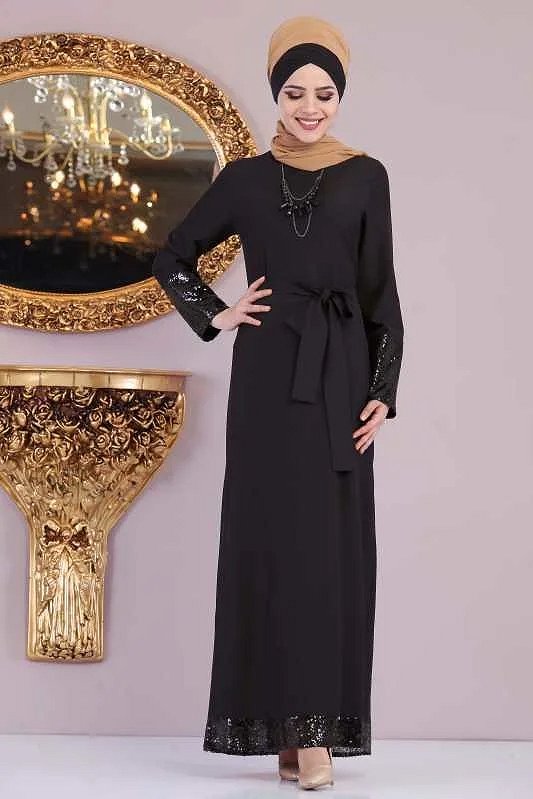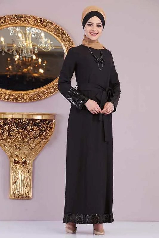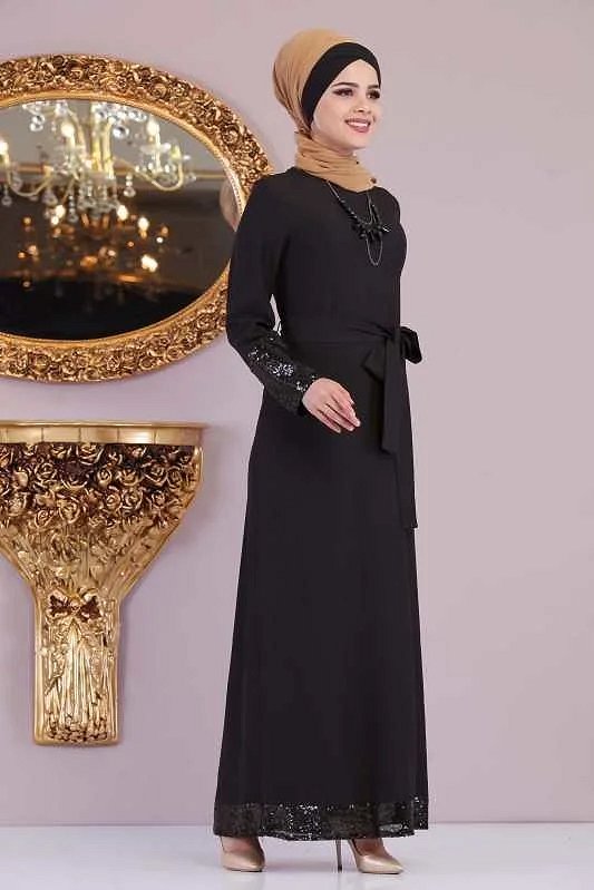Robe de soiree maxi-longue pailletee avec sa ceinture et son collier assorti - Couleur noire (vetements islamiques modernes pour femme)