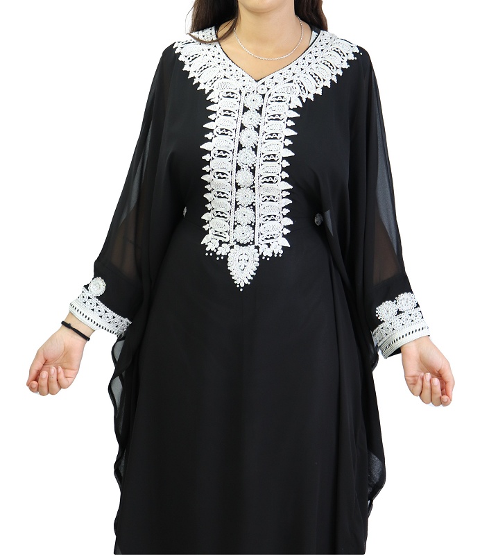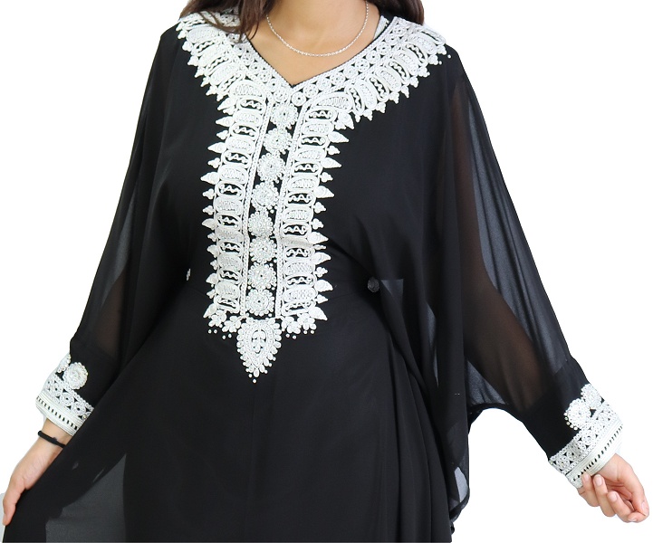 Robe de soirée style Abaya Dubaï noire ouverte de qualité avec broderie et strass et ceinture interne - REF. 38191 (49.00 €)