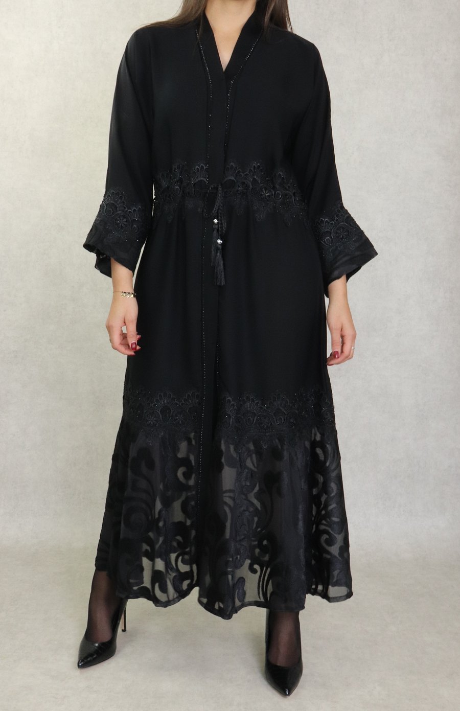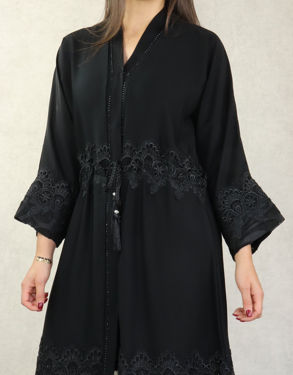 Robe Abaya Kimono Dubaï noire de qualité avec ceinture de serrage interne, strass, perles et broderies - REF. 38139 (49.00 €)