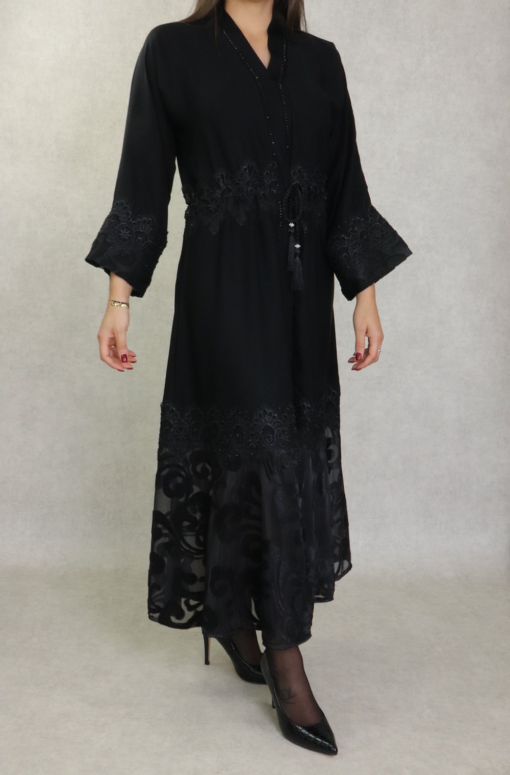 Robe Abaya Dubaï noire de qualité strass et dentelle noires - REF. 38197 (45.00 €)