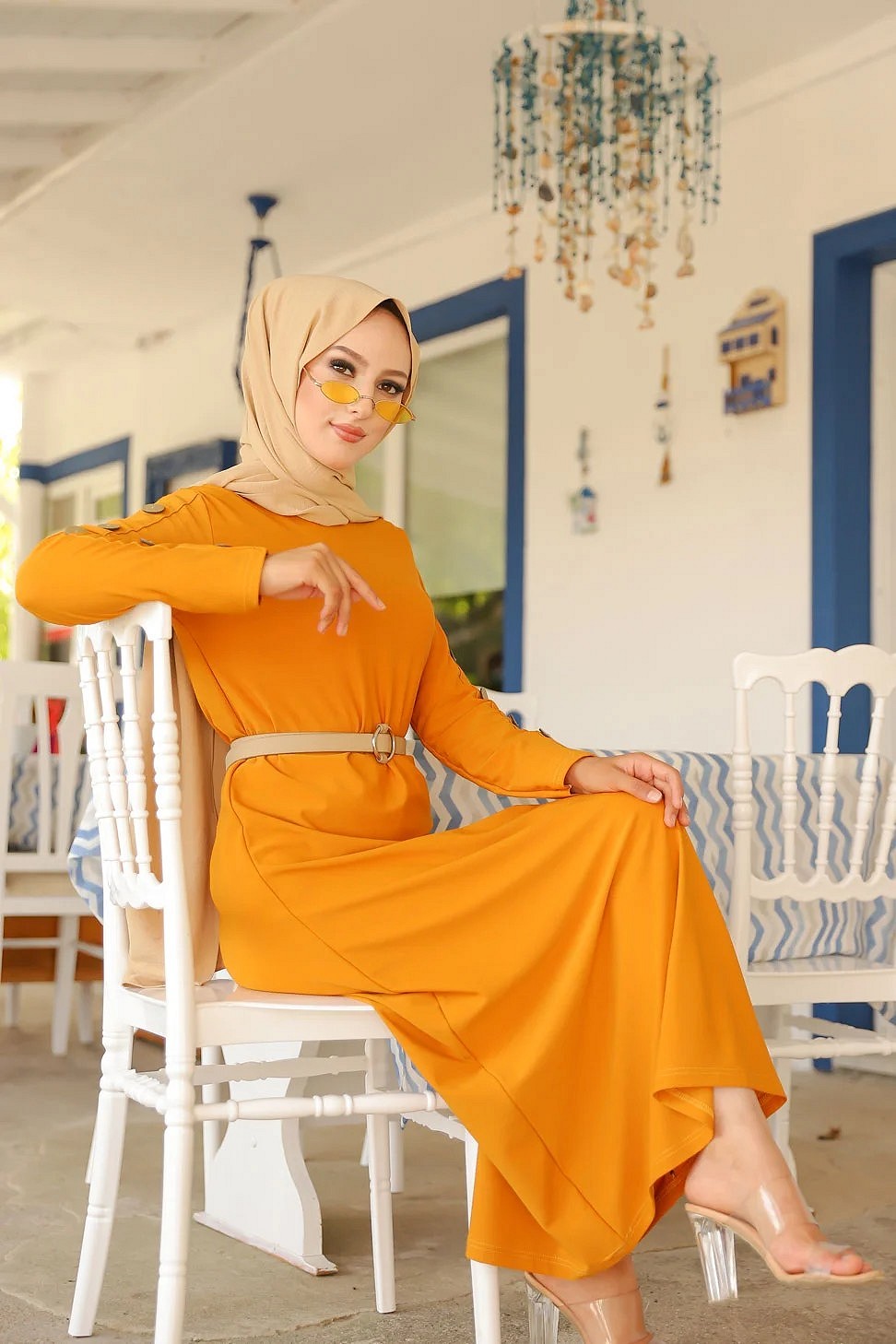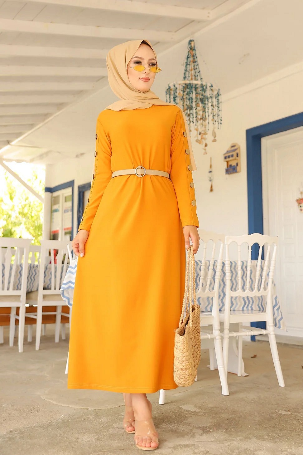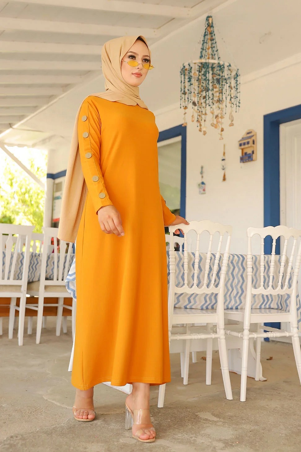 Robe decoree de boutons pour femme voilee - Vetement islamique moderne - Couleur Moutarde