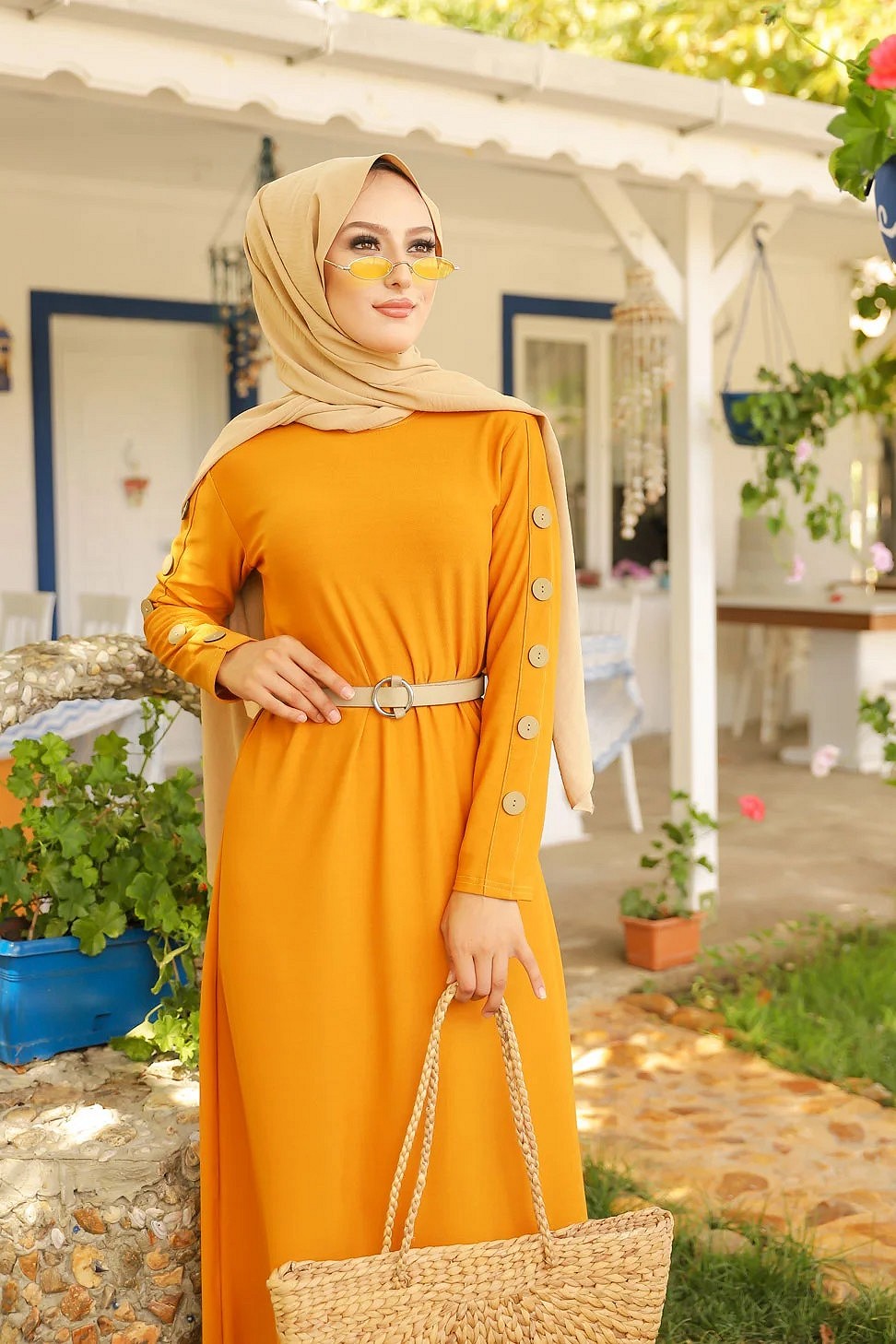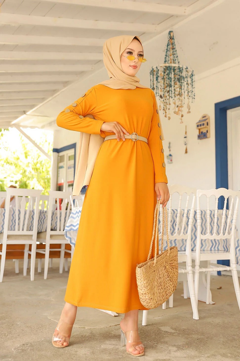 Robe décorée de boutons pour femme voilée - Vêtement islamique moderne - Couleur Moutarde Vetement & Accessoire