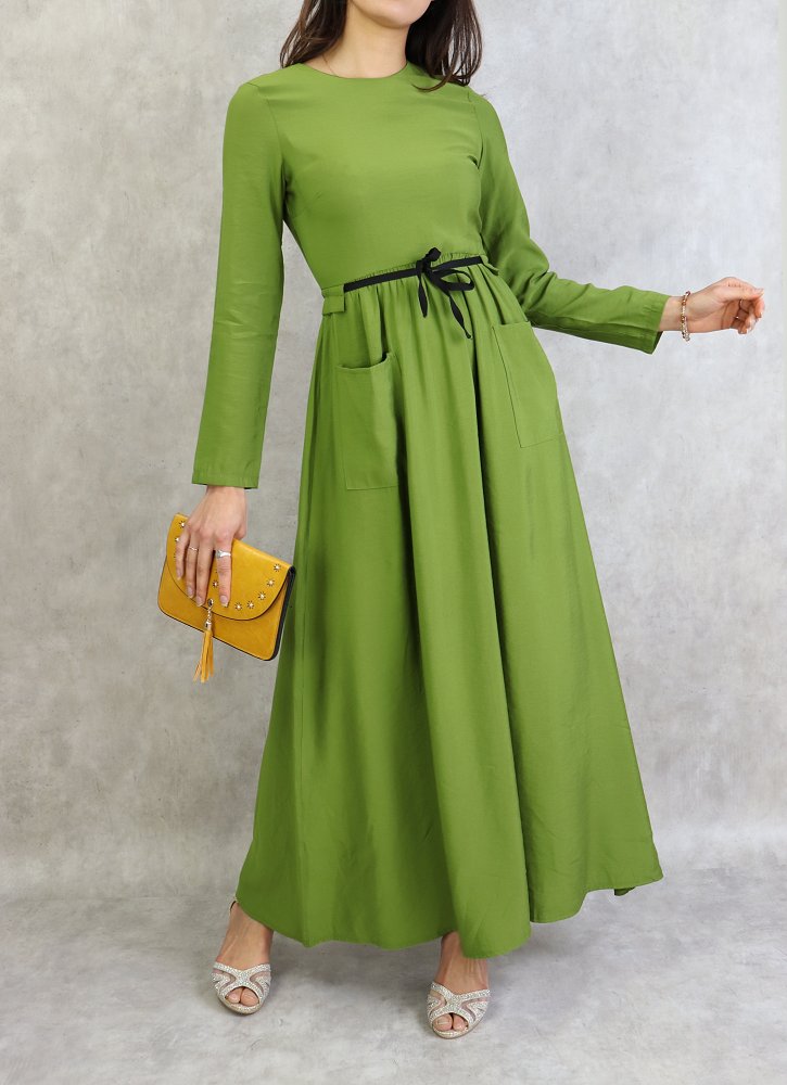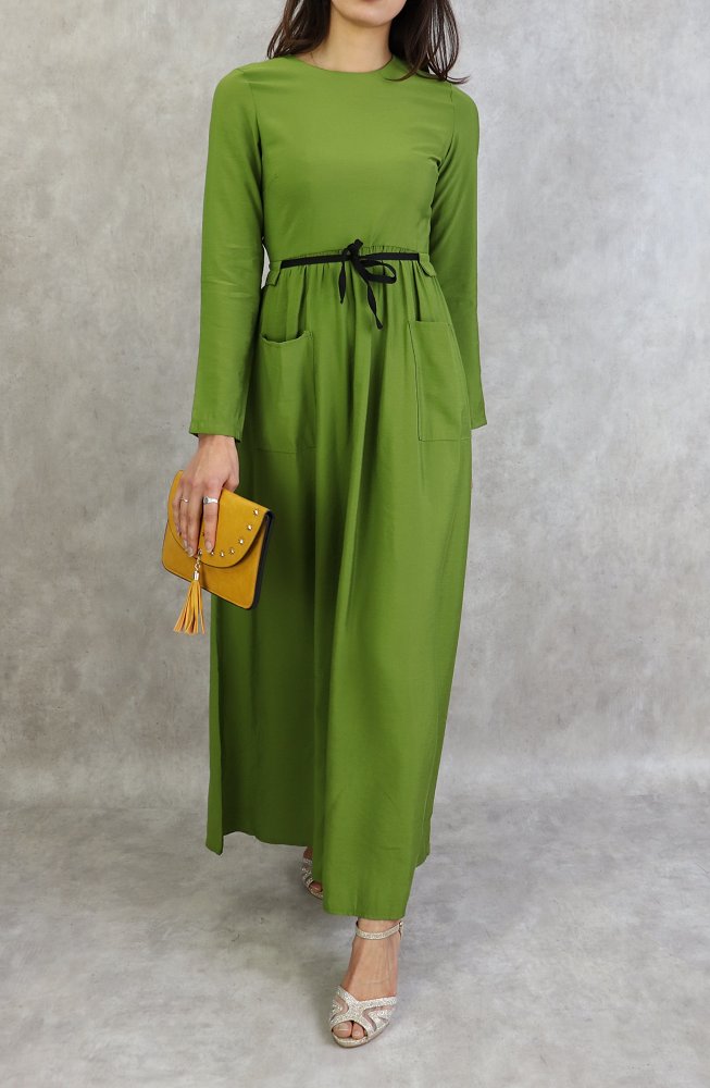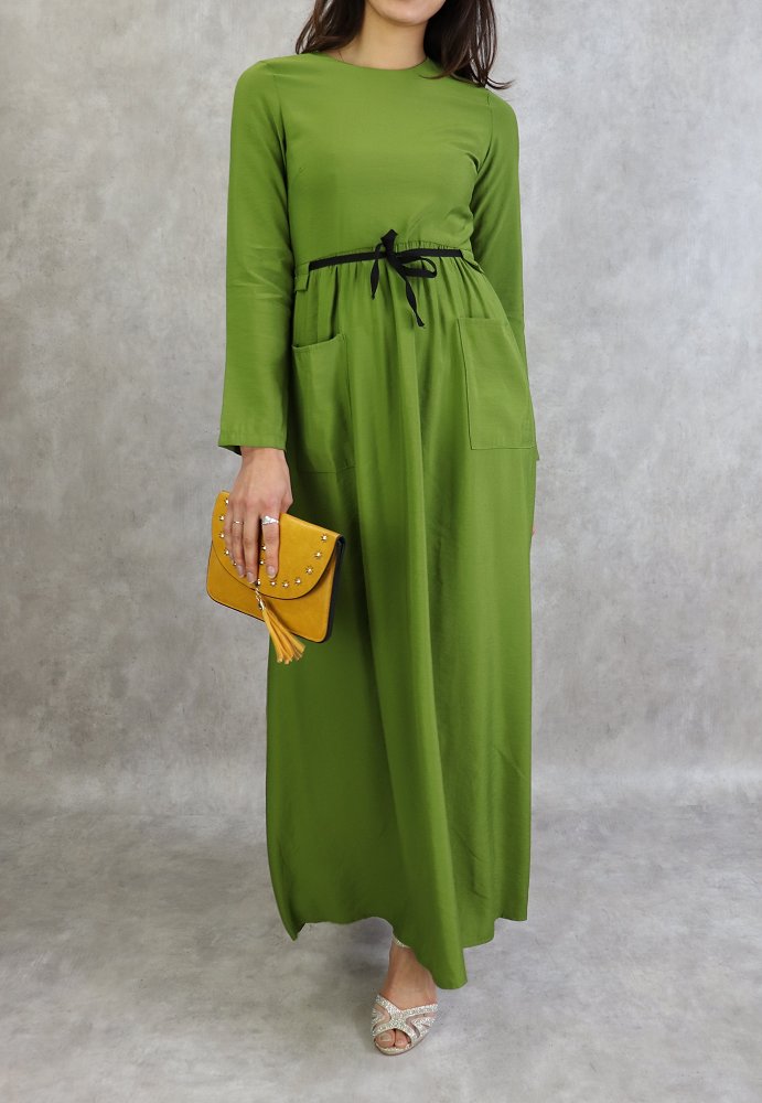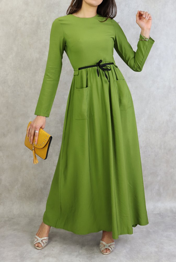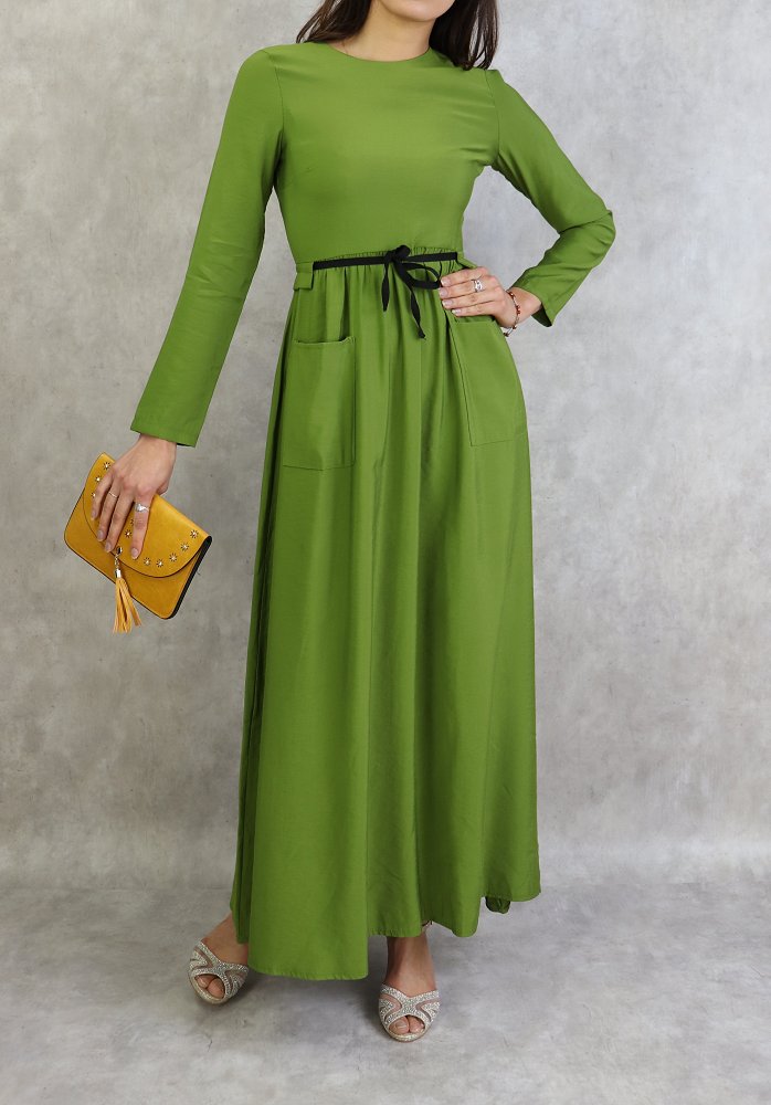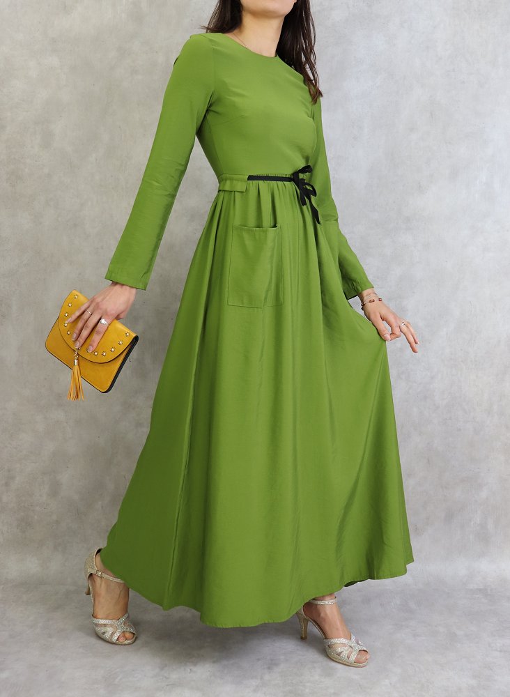 Robe élégante longue et évasée avec lien à nouer à la taille - Couleur Vert Vetement & Accessoire