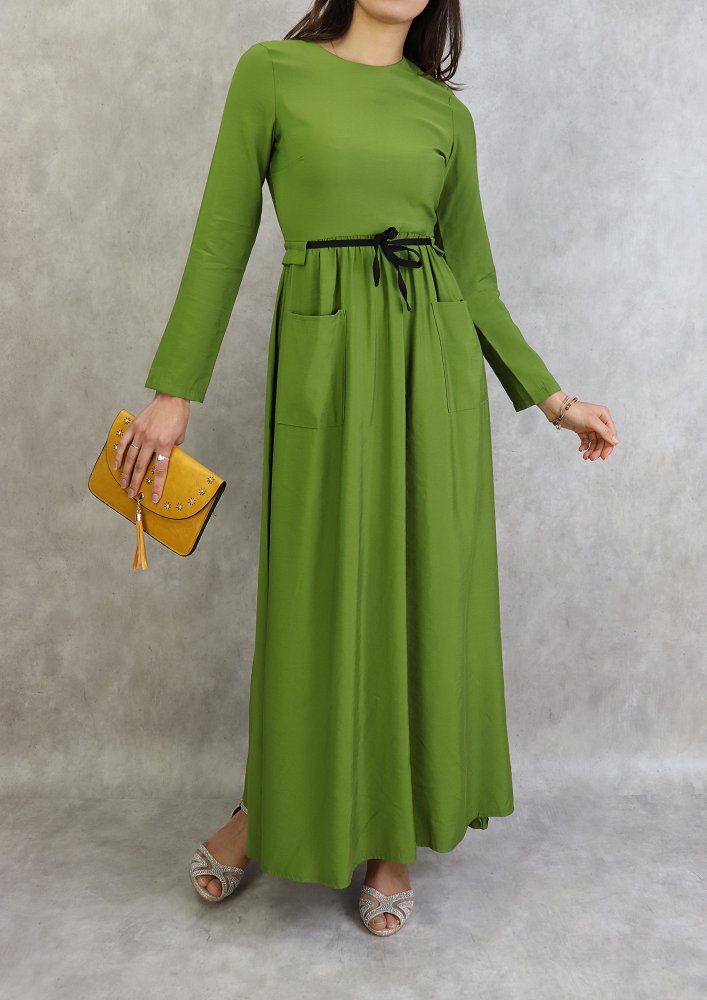 Robe elegante longue et evasee avec lien a nouer a la taille - Couleur Vert
