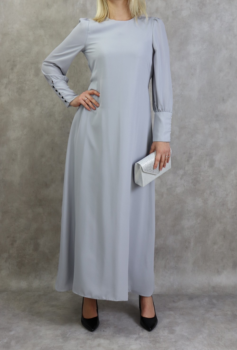 Robe longue, col rond, fermeture à glissière au dos, manches longues froncées finition 5 boutons aux poignets, ceinture assortie à passants. Coupe droite, tissu de qualité supérieur, légèrement satiné, doux, et fluide. Robe entièrement doublé.