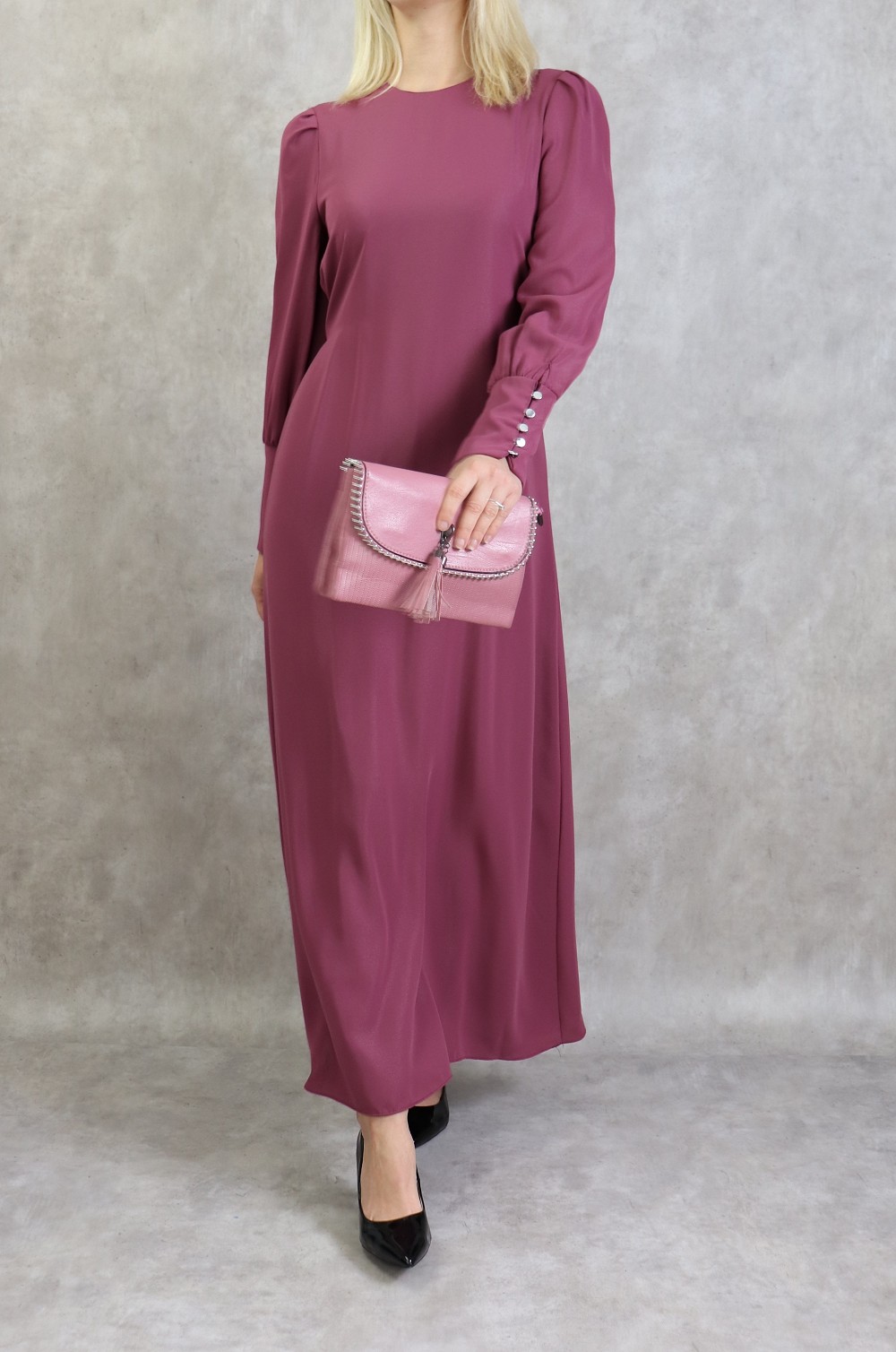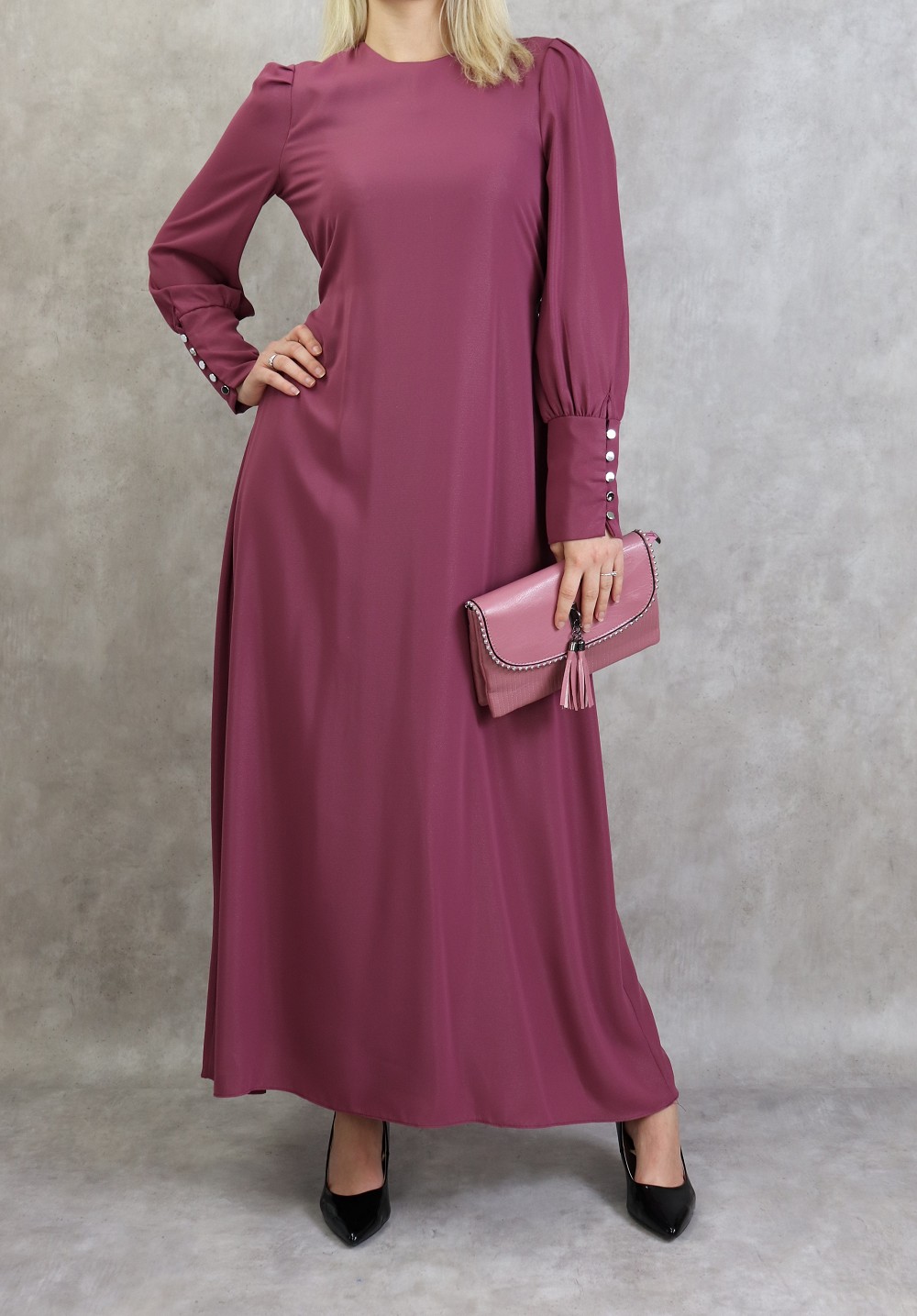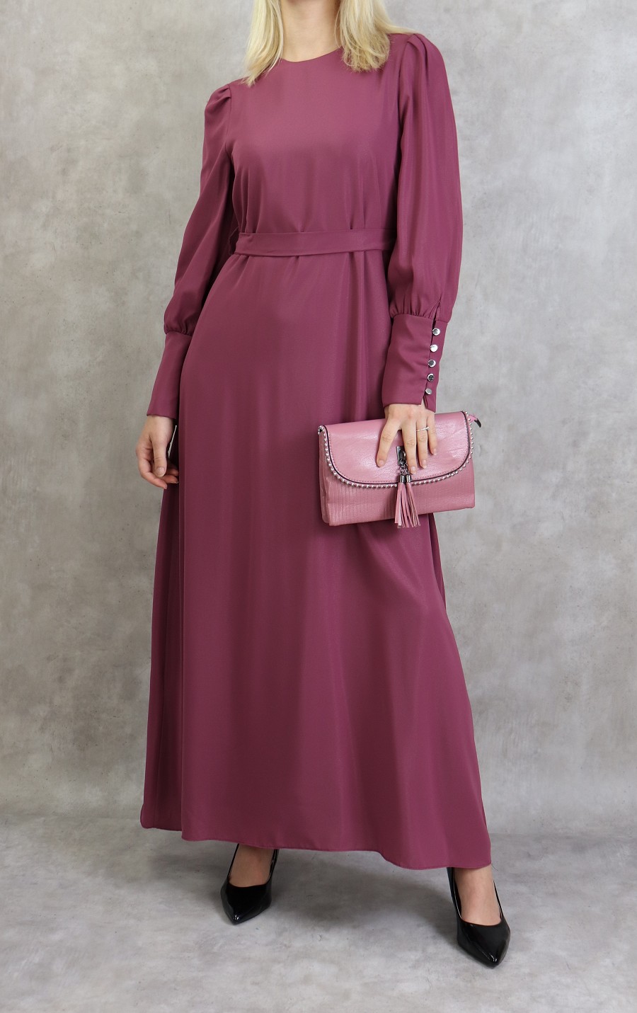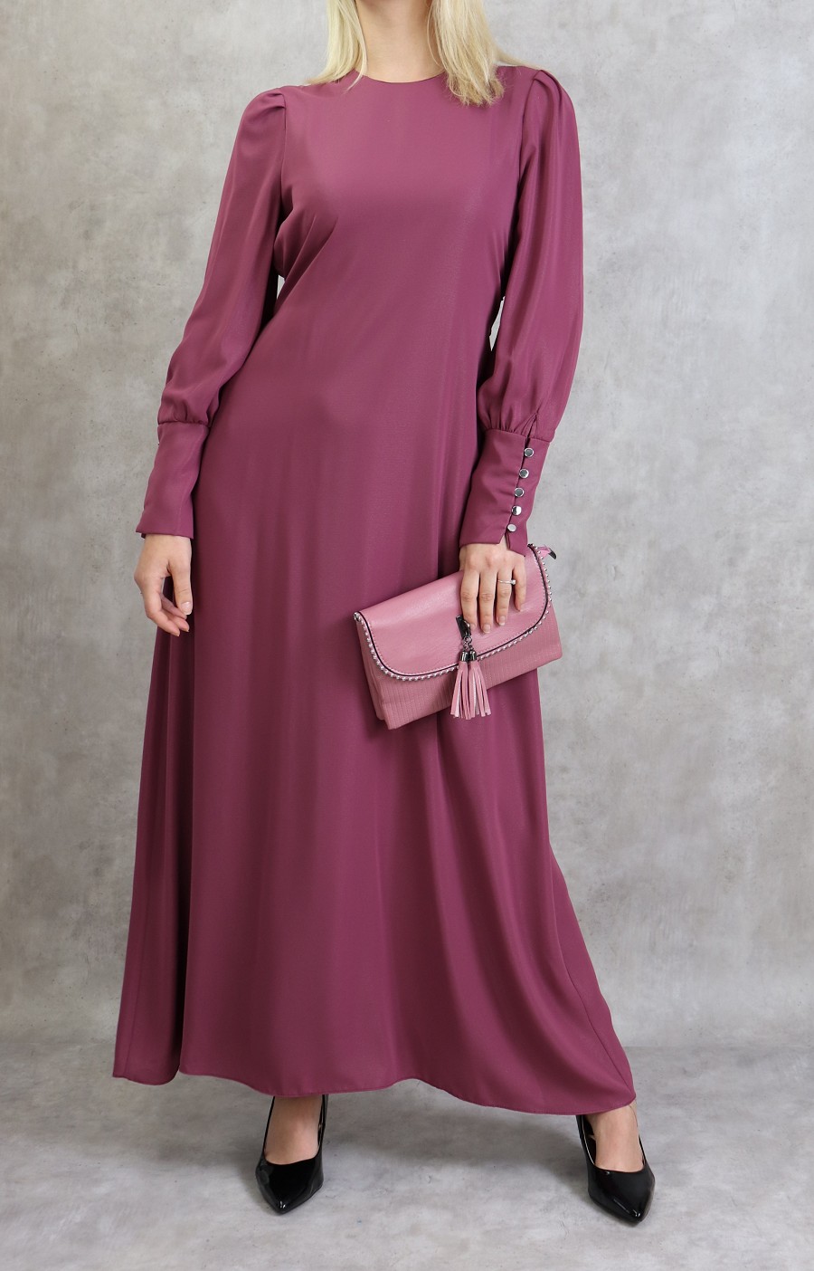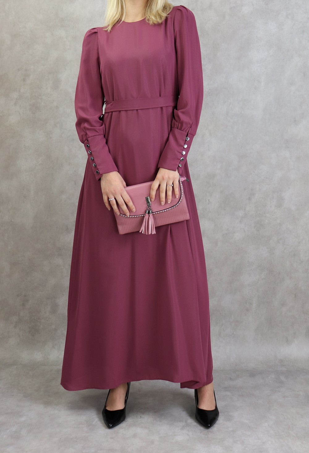 Robe longue, col rond, fermeture à glissière au dos, manches longues froncées finition 5 boutons aux poignets, ceinture assortie à passants. Coupe droite, tissu de qualité supérieur, légèrement satiné, doux, et fluide. Robe entièrement doublé.