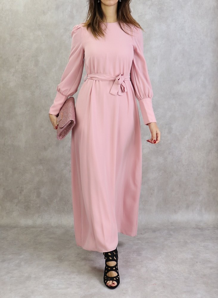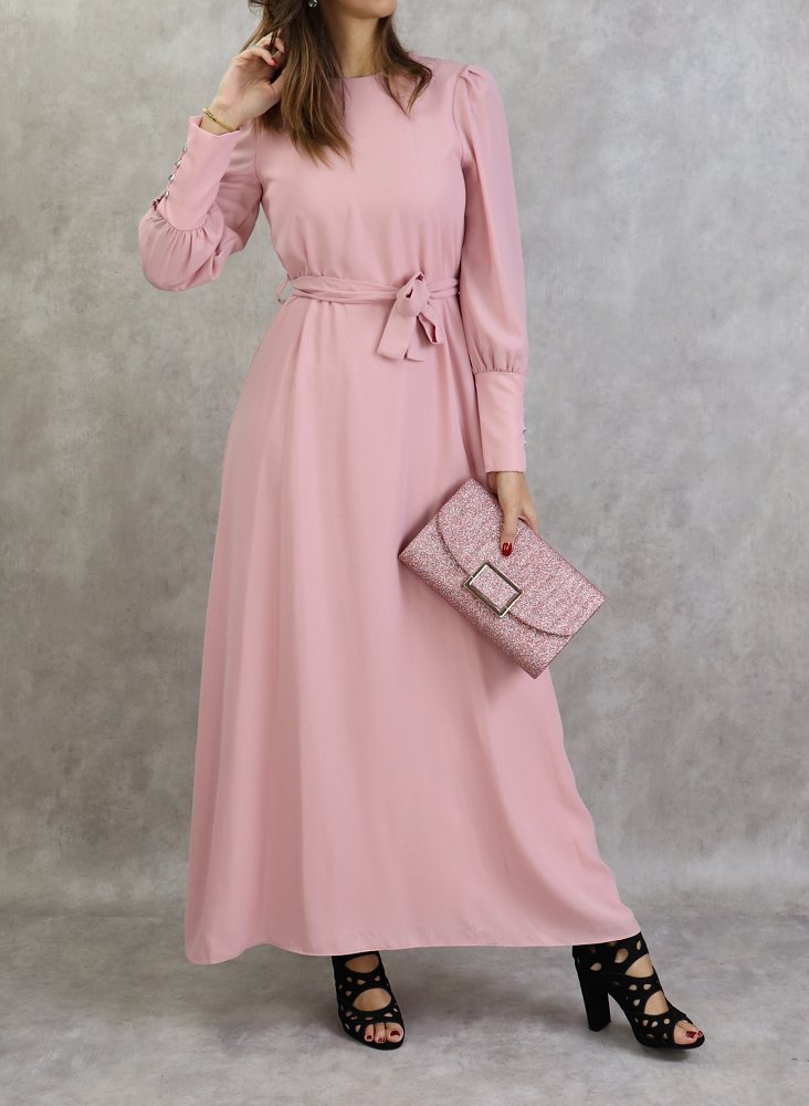 Robe longue, col rond, fermeture à glissière au dos, manches longues froncées finition 5 boutons aux poignets, ceinture assortie à passants. Coupe droite, tissu de qualité supérieur, légèrement satiné, doux, et fluide. Robe entièrement doublé.