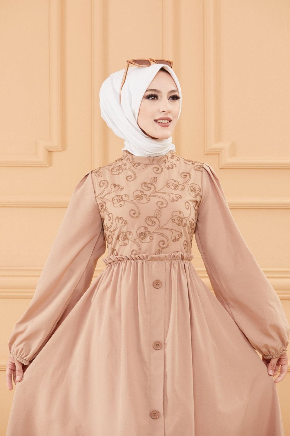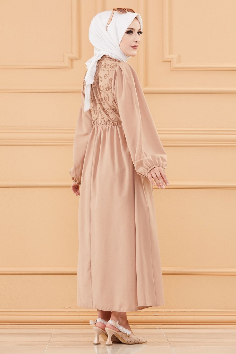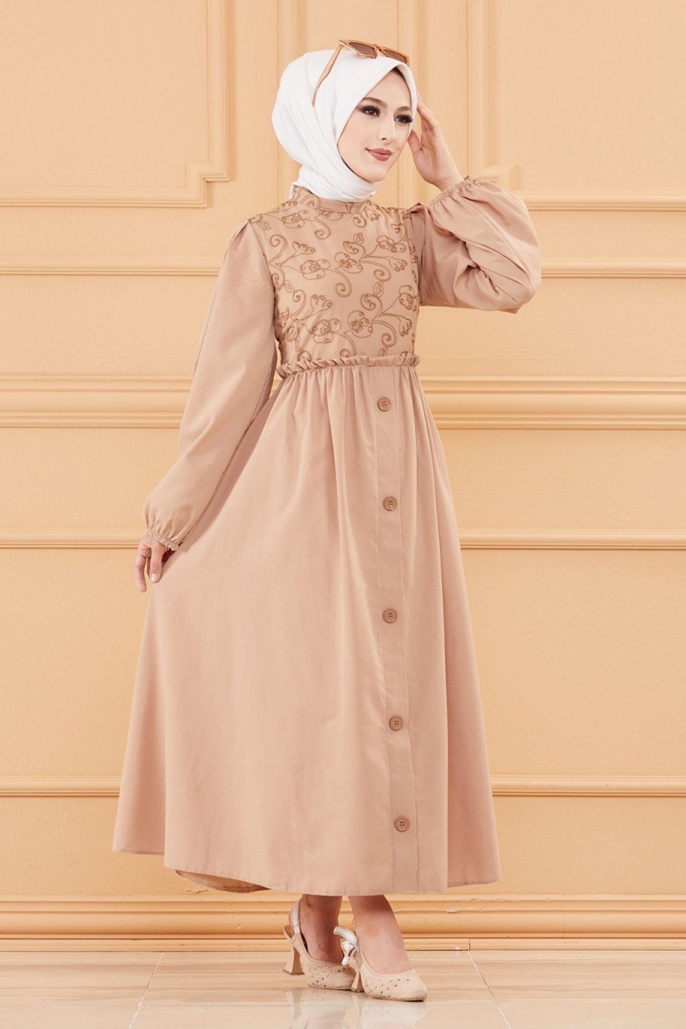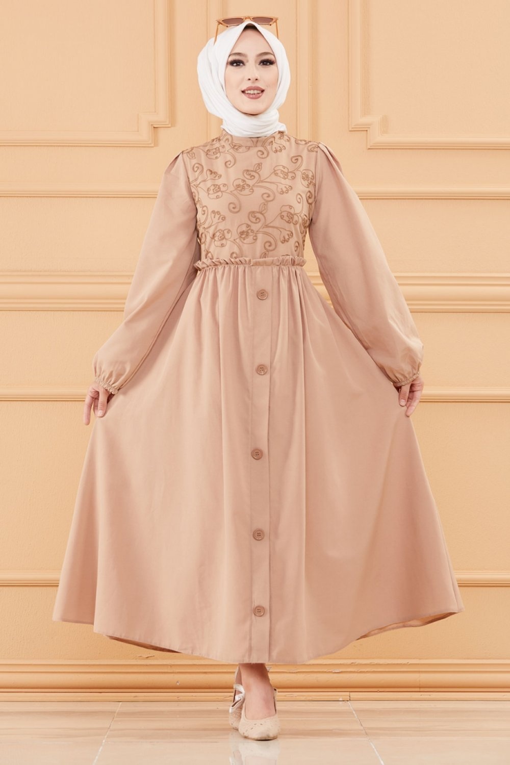 Robe en coton ample et évasée avec broderies discrètes pour femme (Vêtement style habillé pour hijab) - Couleur beige Vetement & Accessoire