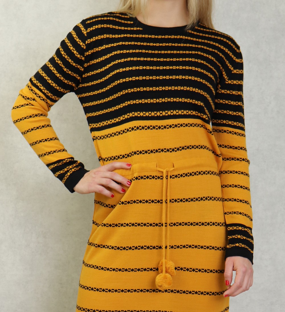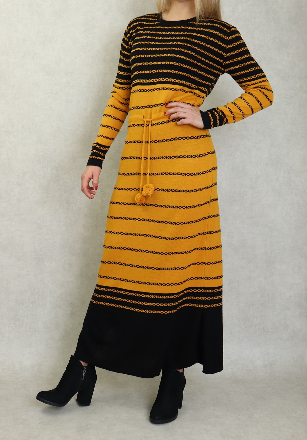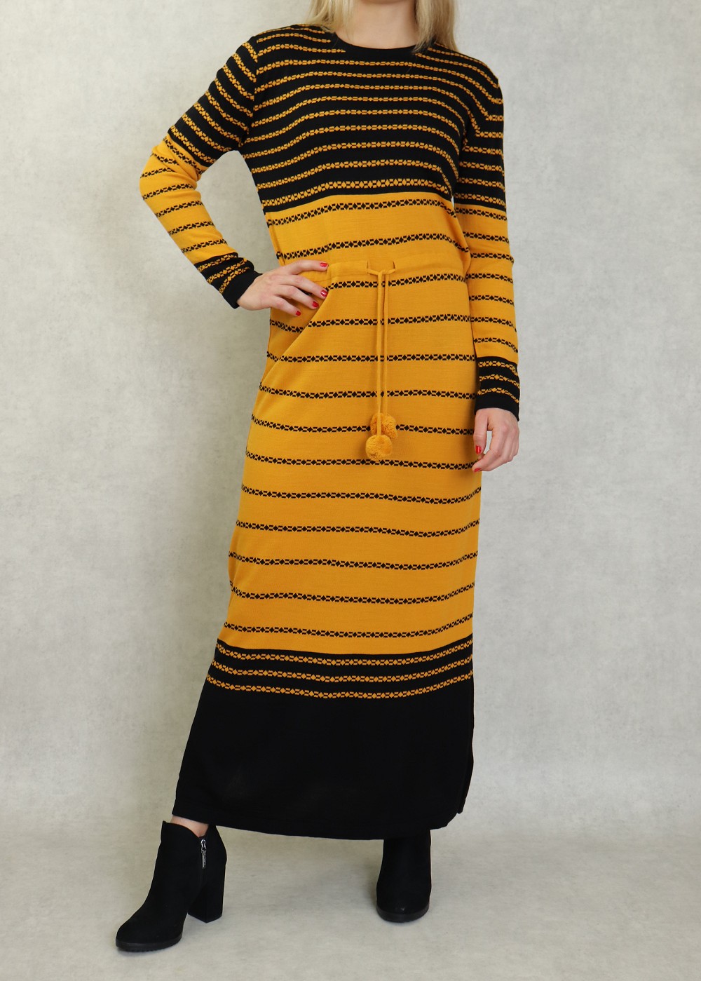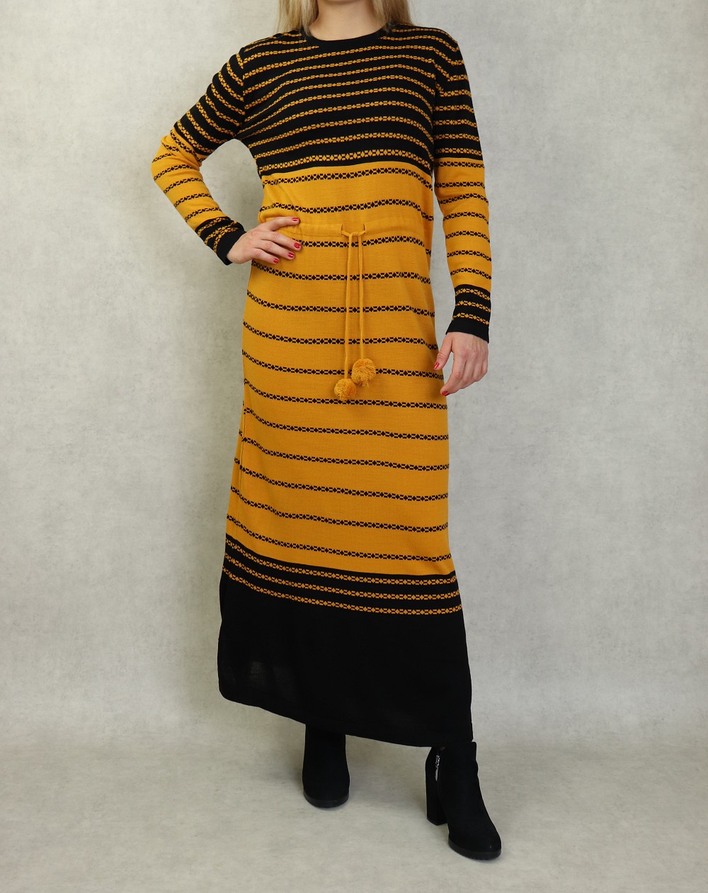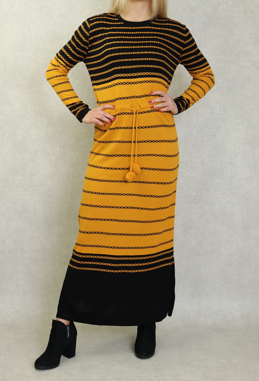 Robe en maille a rayures pour femme (Saison Automne-Hiver) - Couleur Jaune moutarde et Noir