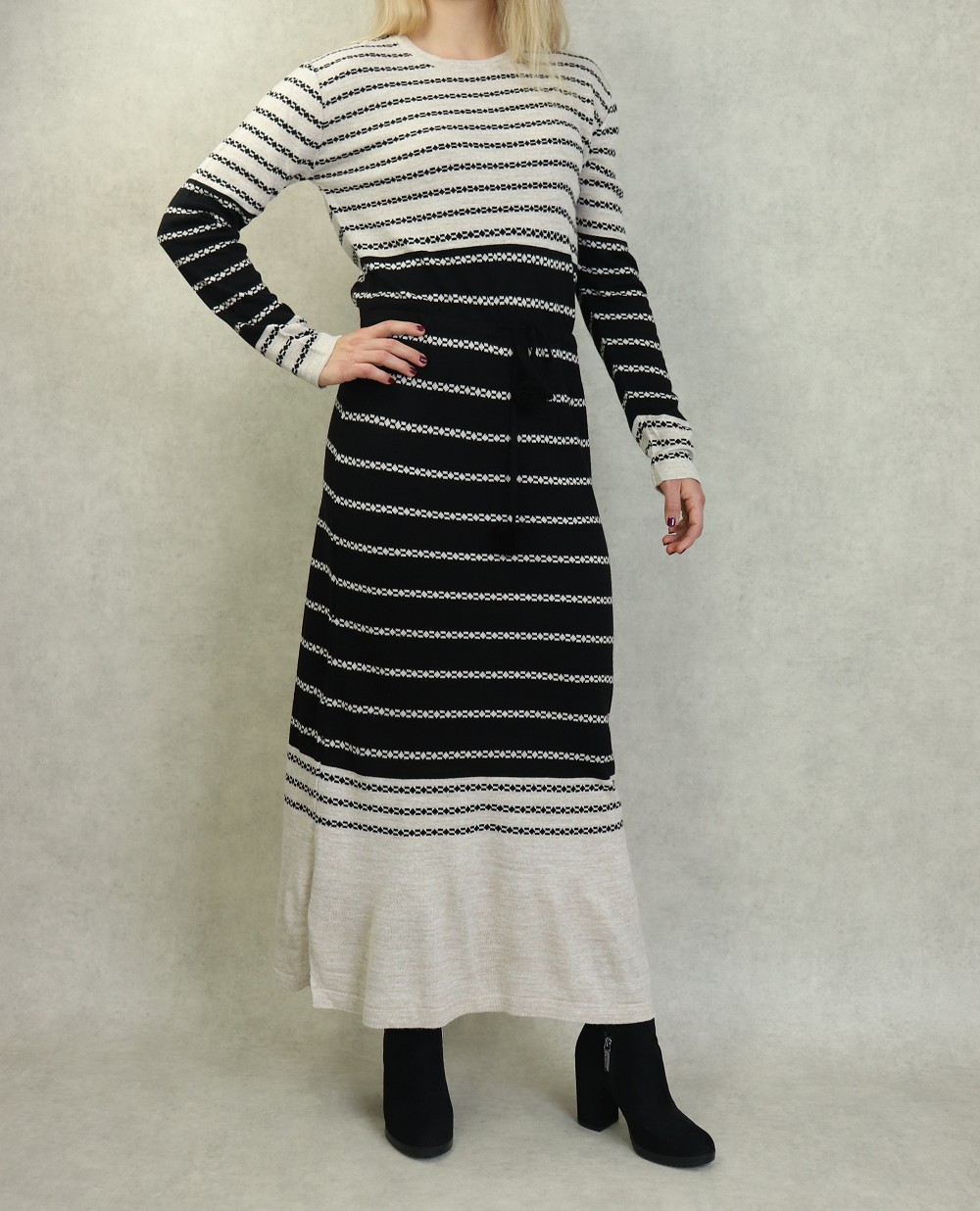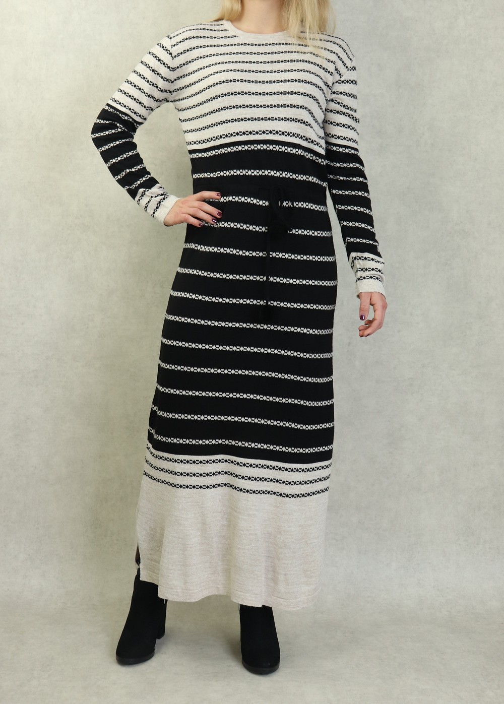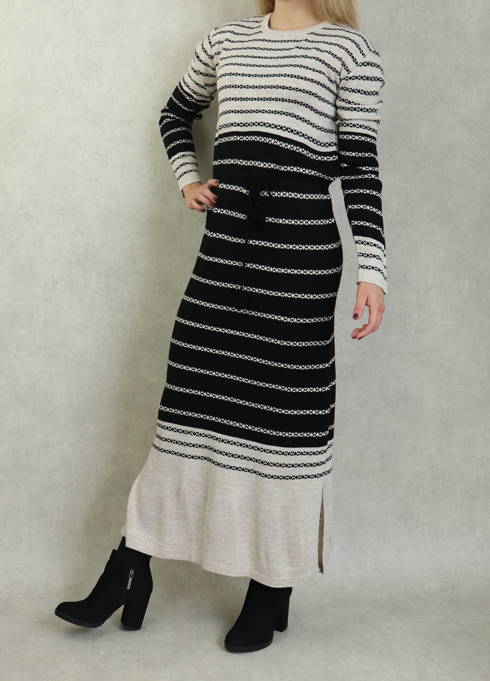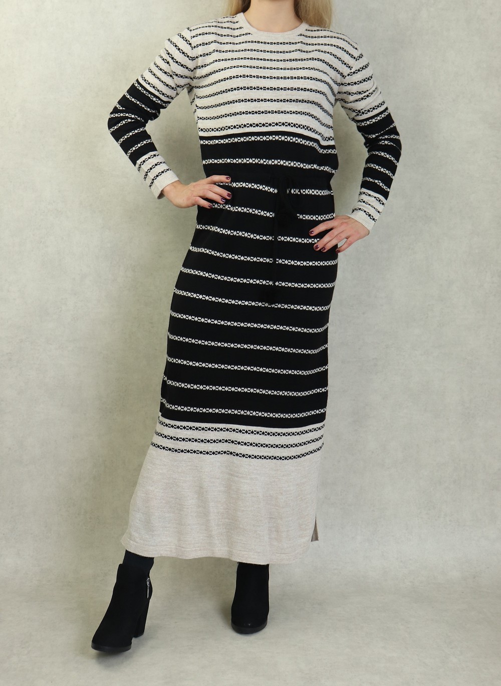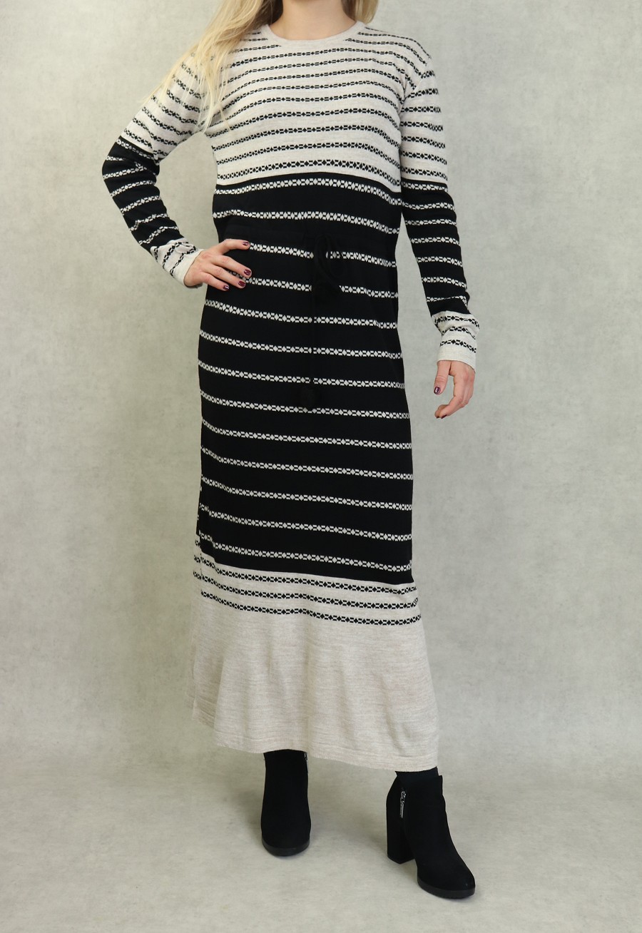 Robe en maille à rayures pour femme avec pompon (Vetement Automne-Hiver) - Couleur Crème et Noir Vetement & Accessoire