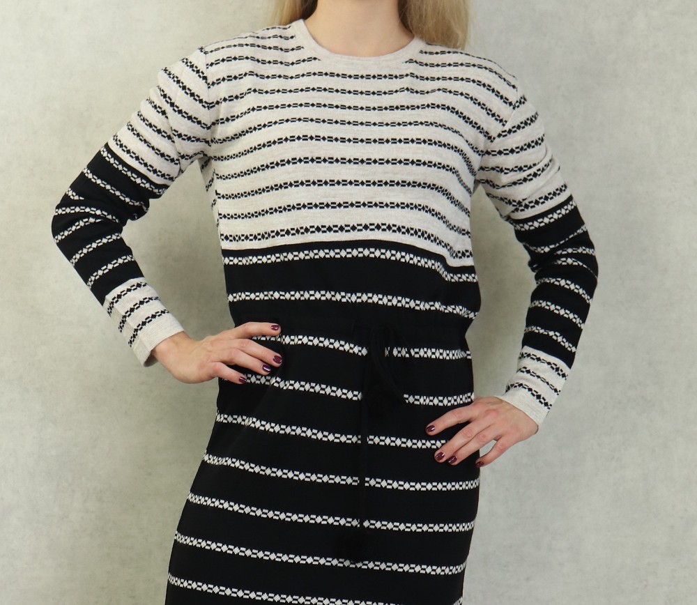 Robe en maille a rayures pour femme avec pompon (Vetement Automne-Hiver) - Couleur Creme et Noir