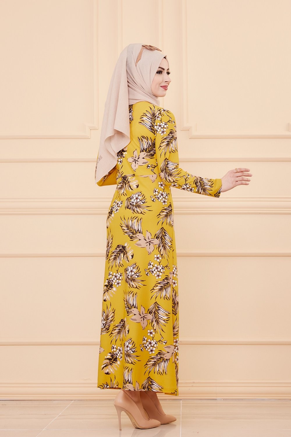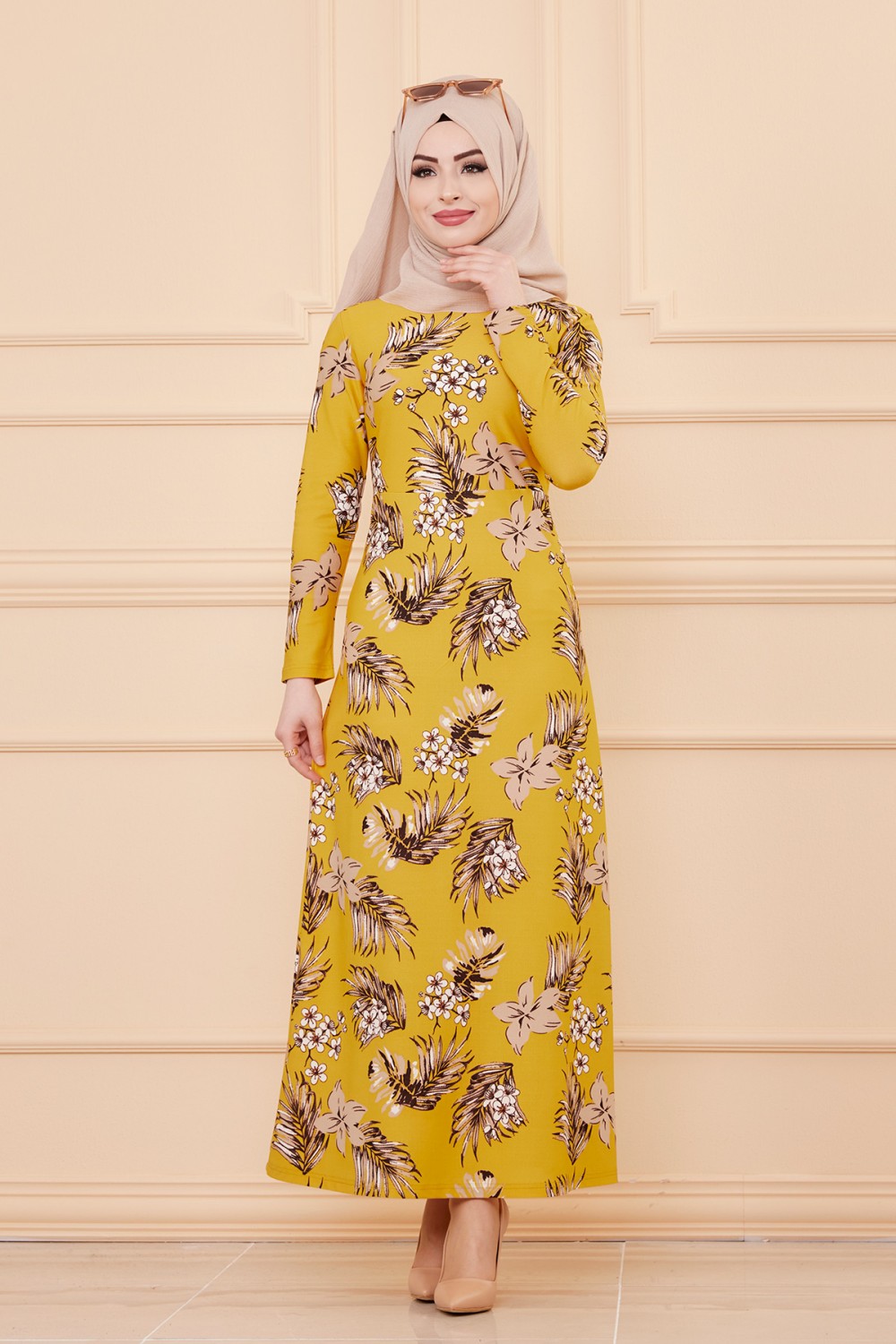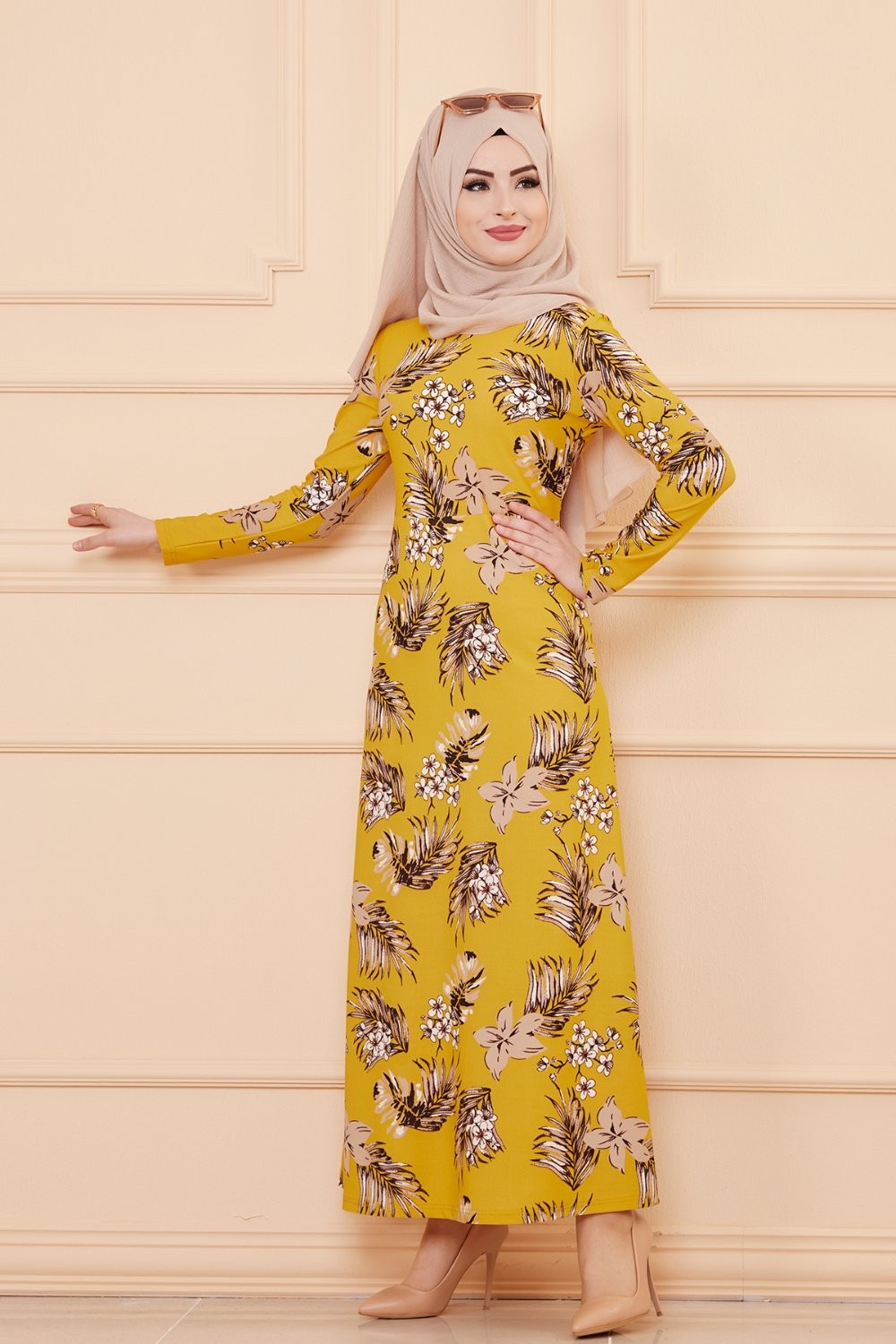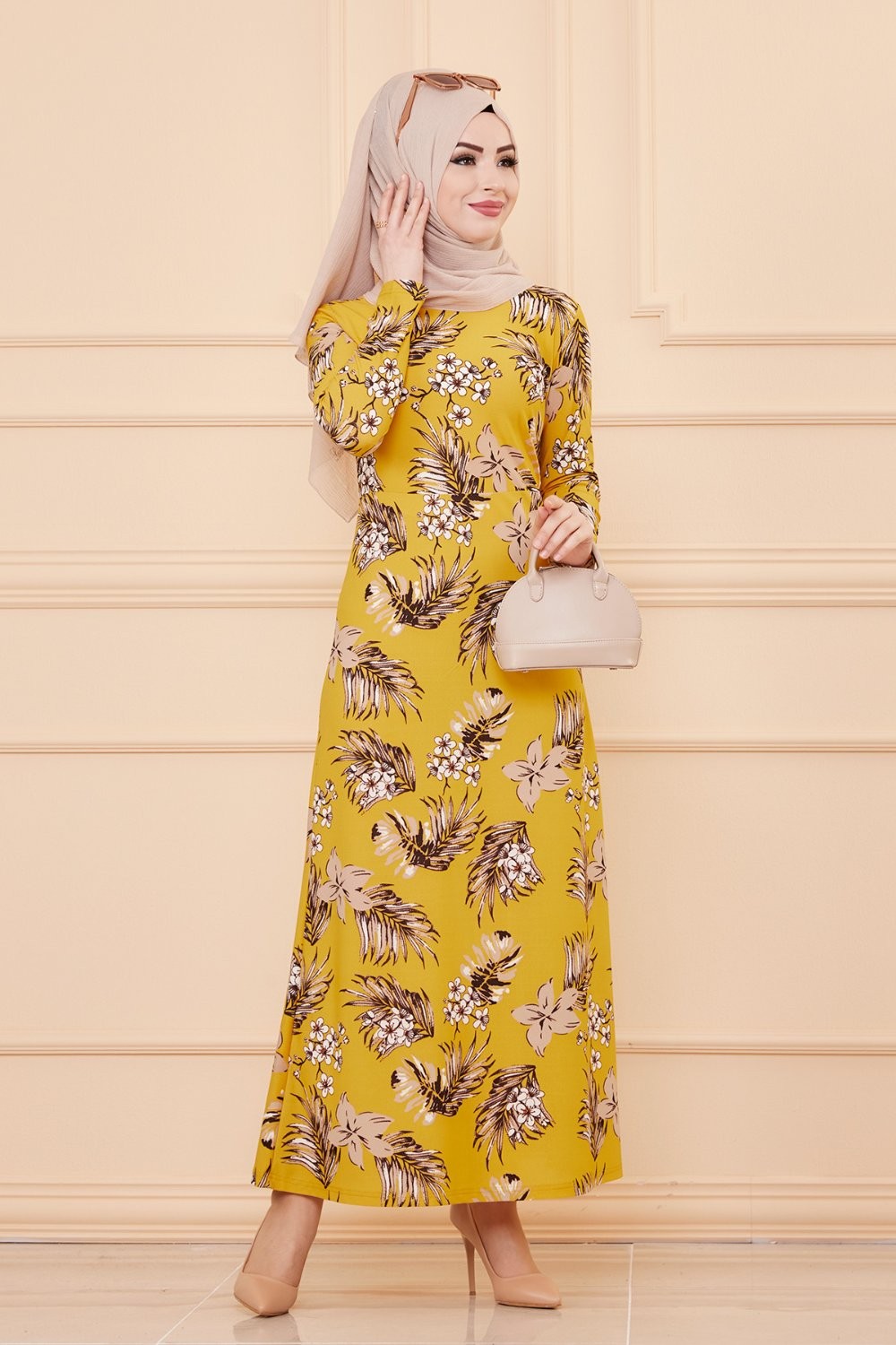 Robe longue fleurie coupe évasée pour femme (Mode Musulmane) - Couleur motifs kaki et orange - REF. 33846 (19.90 €)