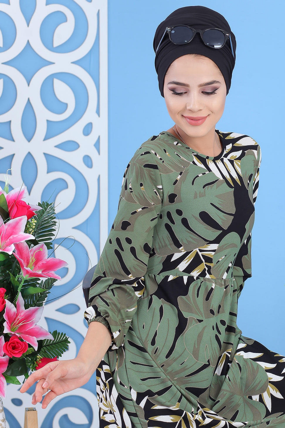 Robe longue imprimés fleurs (Vêtement style femme voilée) - Couleur kaki - REF. 32263 (24.90 €)