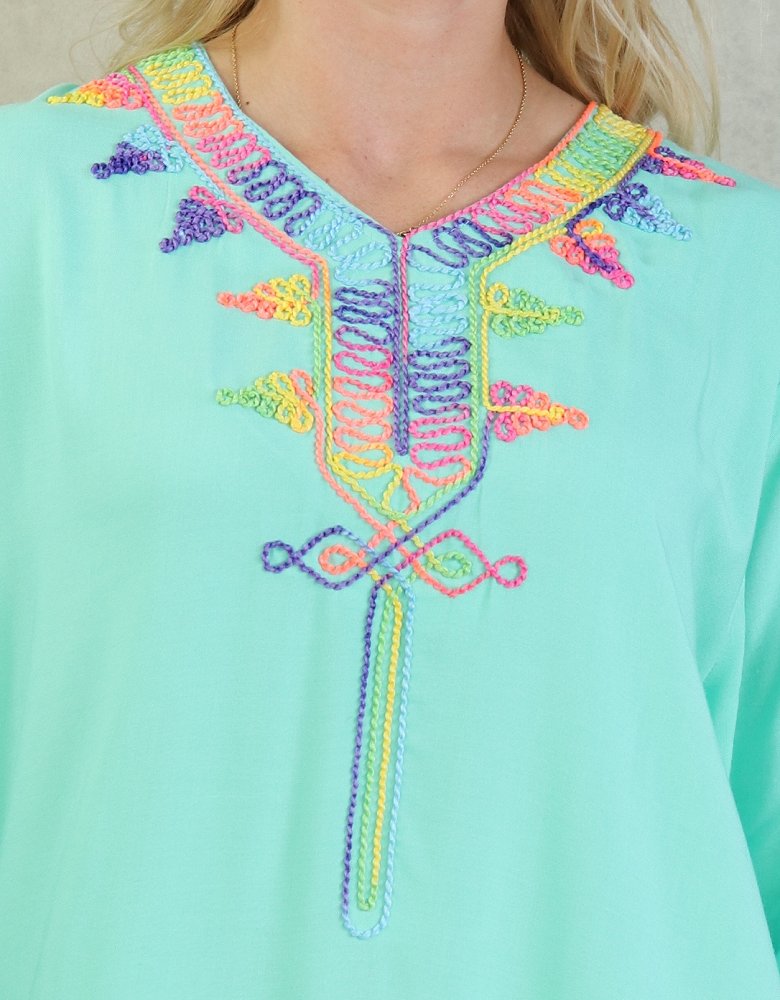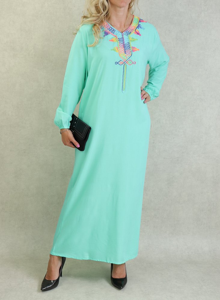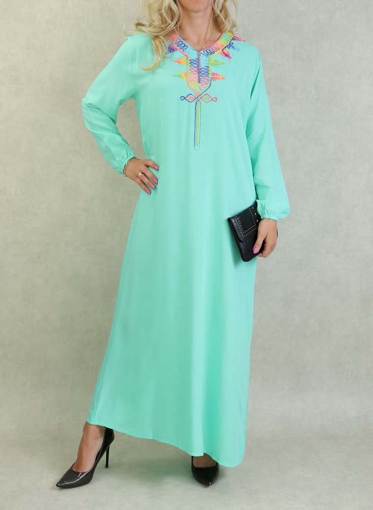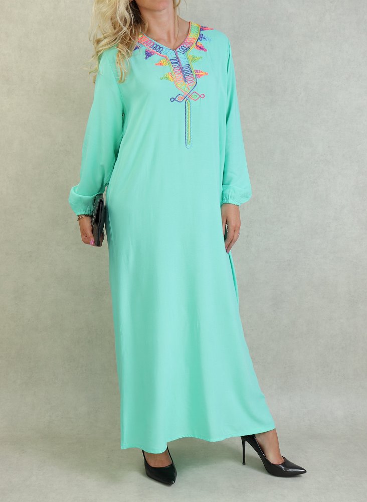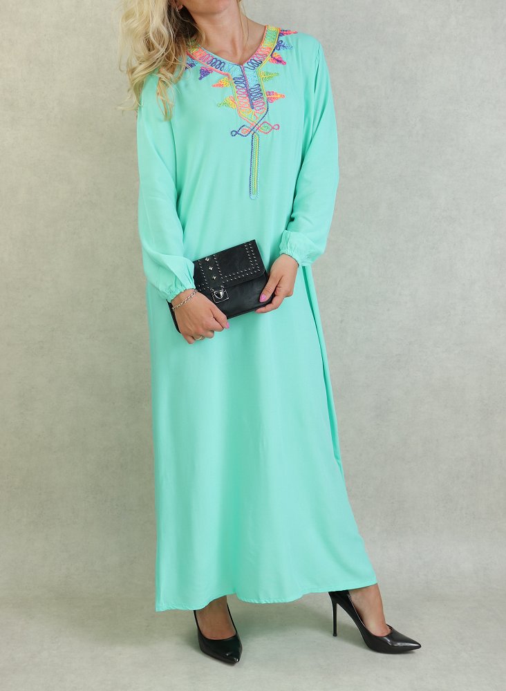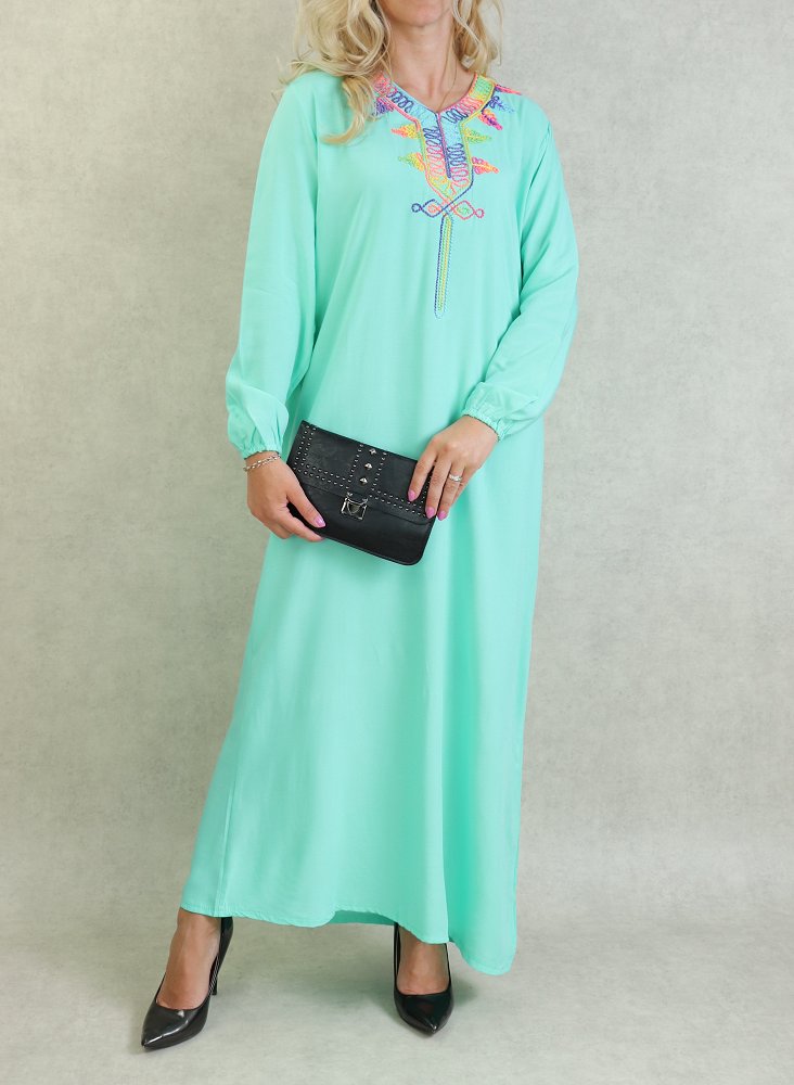 Robe fluide à manches longues avec broderies multicolore - Couleur Vert d'eau Vetement & Accessoire