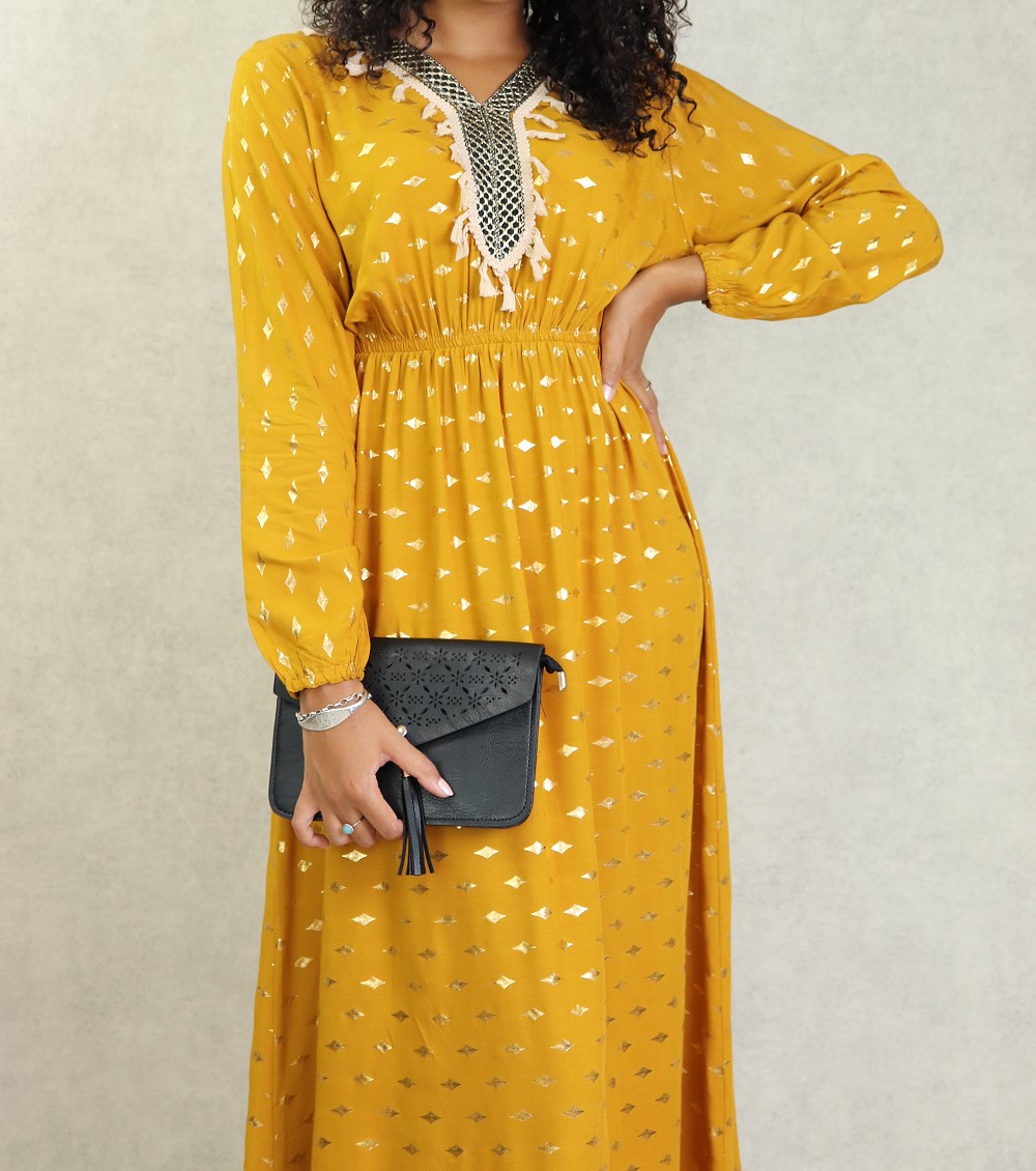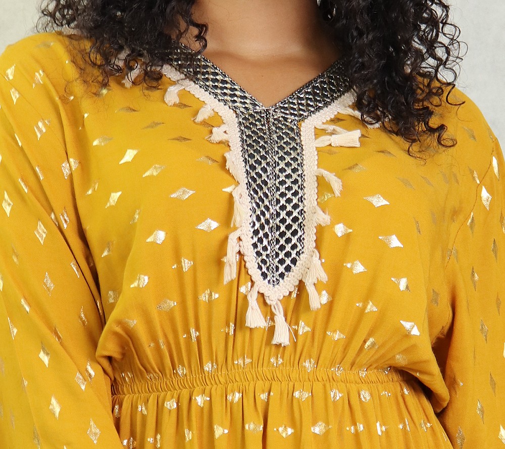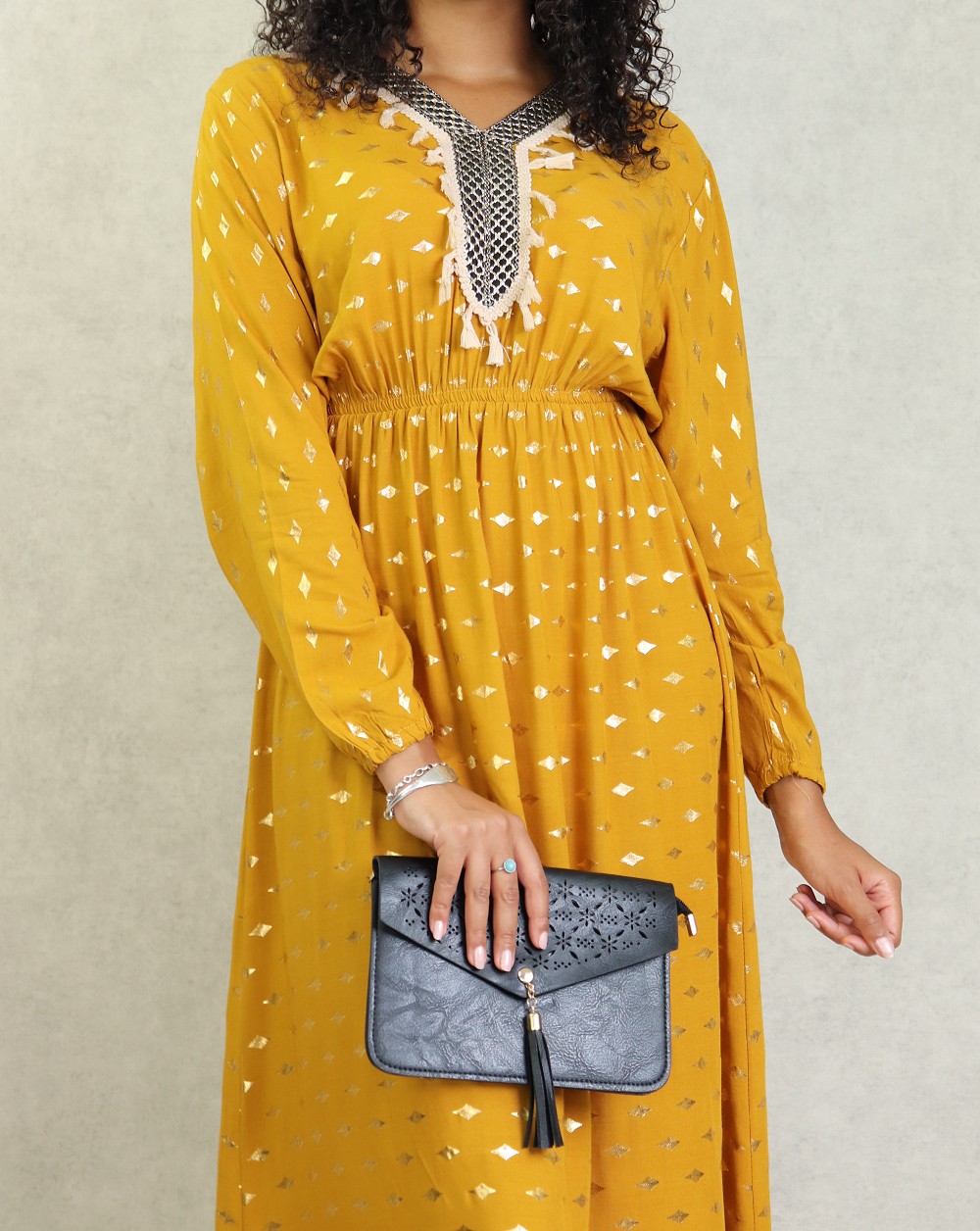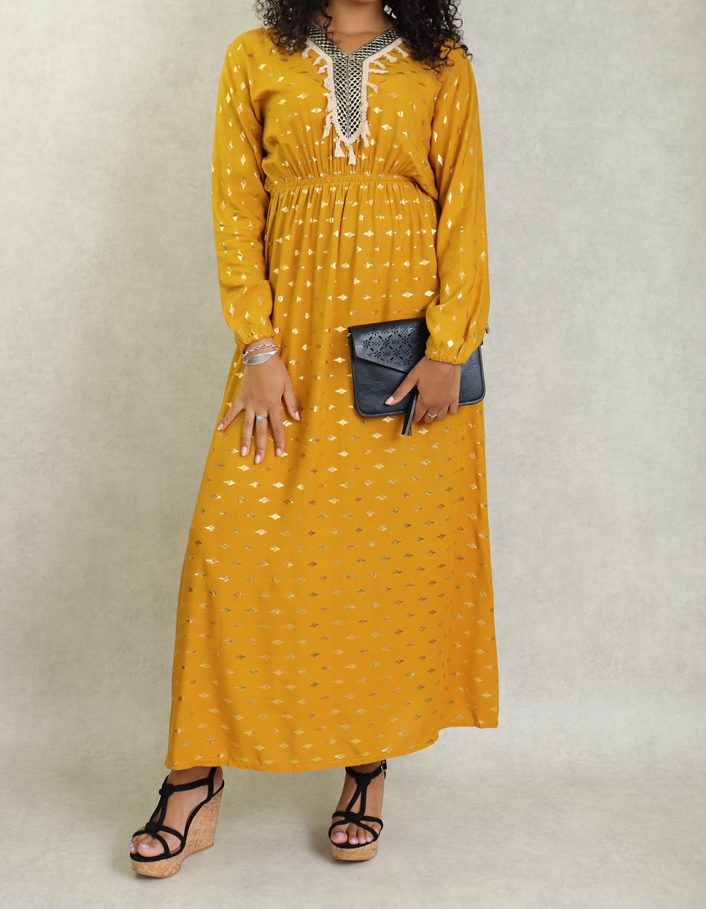 Robe fluide avec motifs dorés broderies et pompons pour femme - Couleur Jaune moutarde Vetement & Accessoire