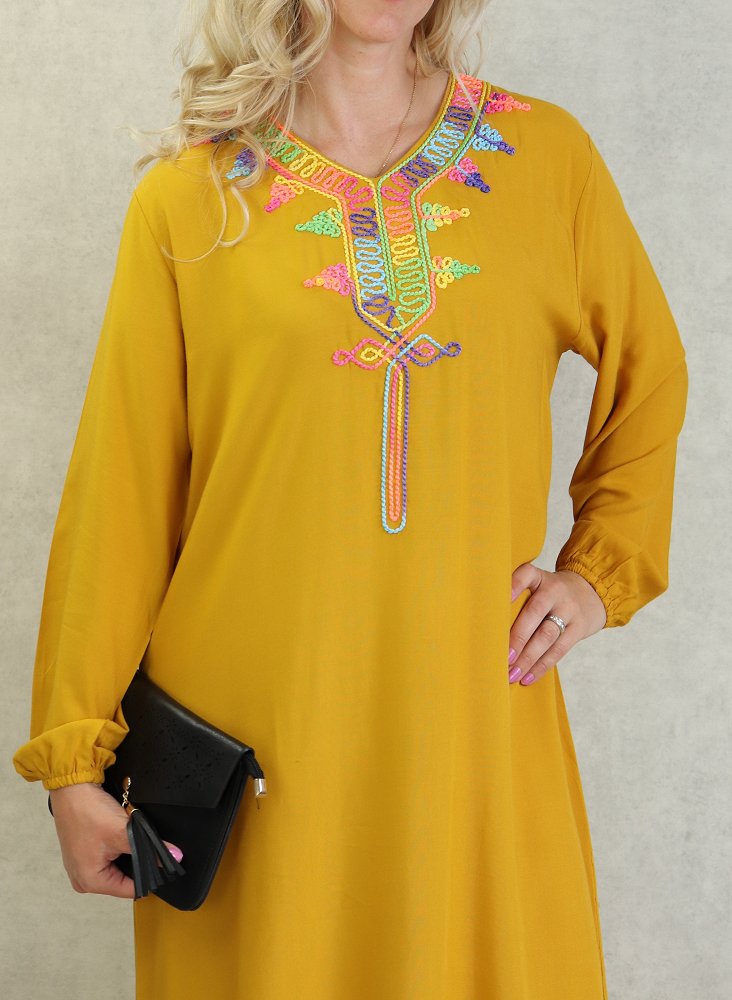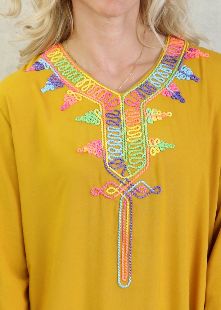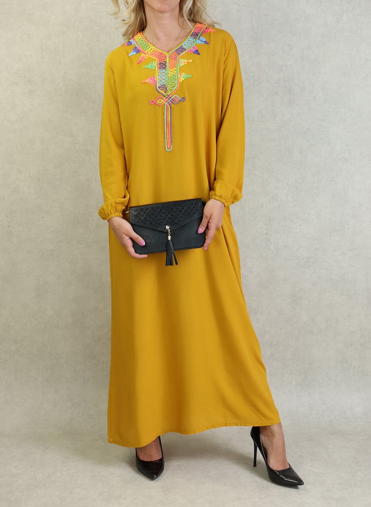 Robe fluide d'été à manches longues avec broderies multicolore - Couleur Jaune moutarde Vetement & Accessoire