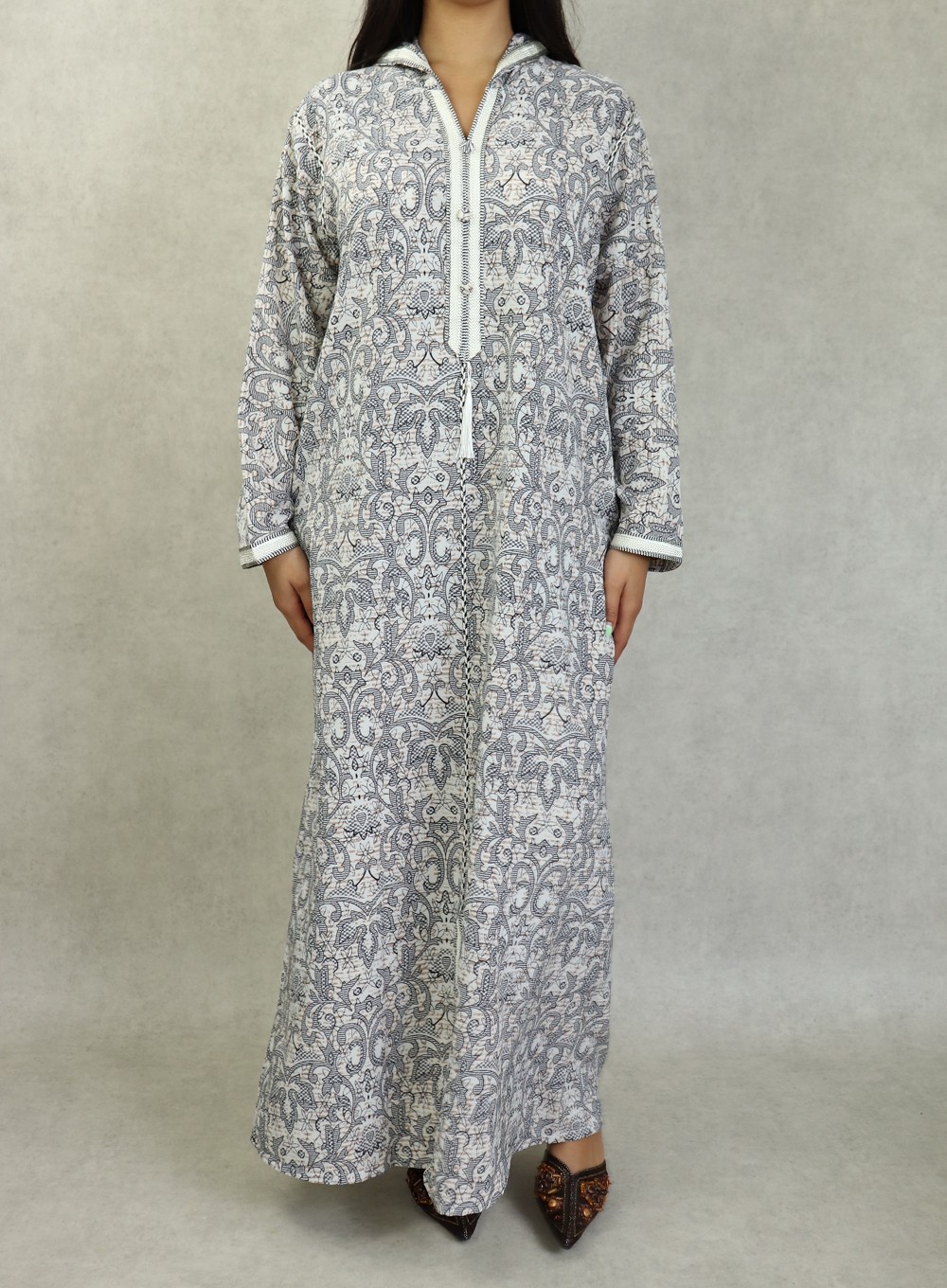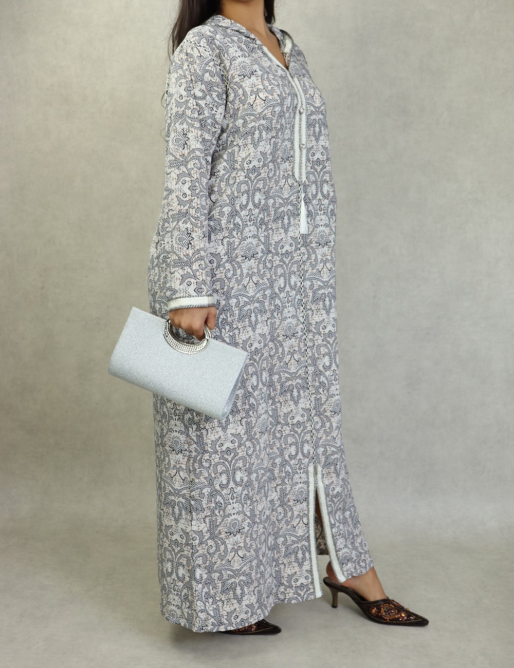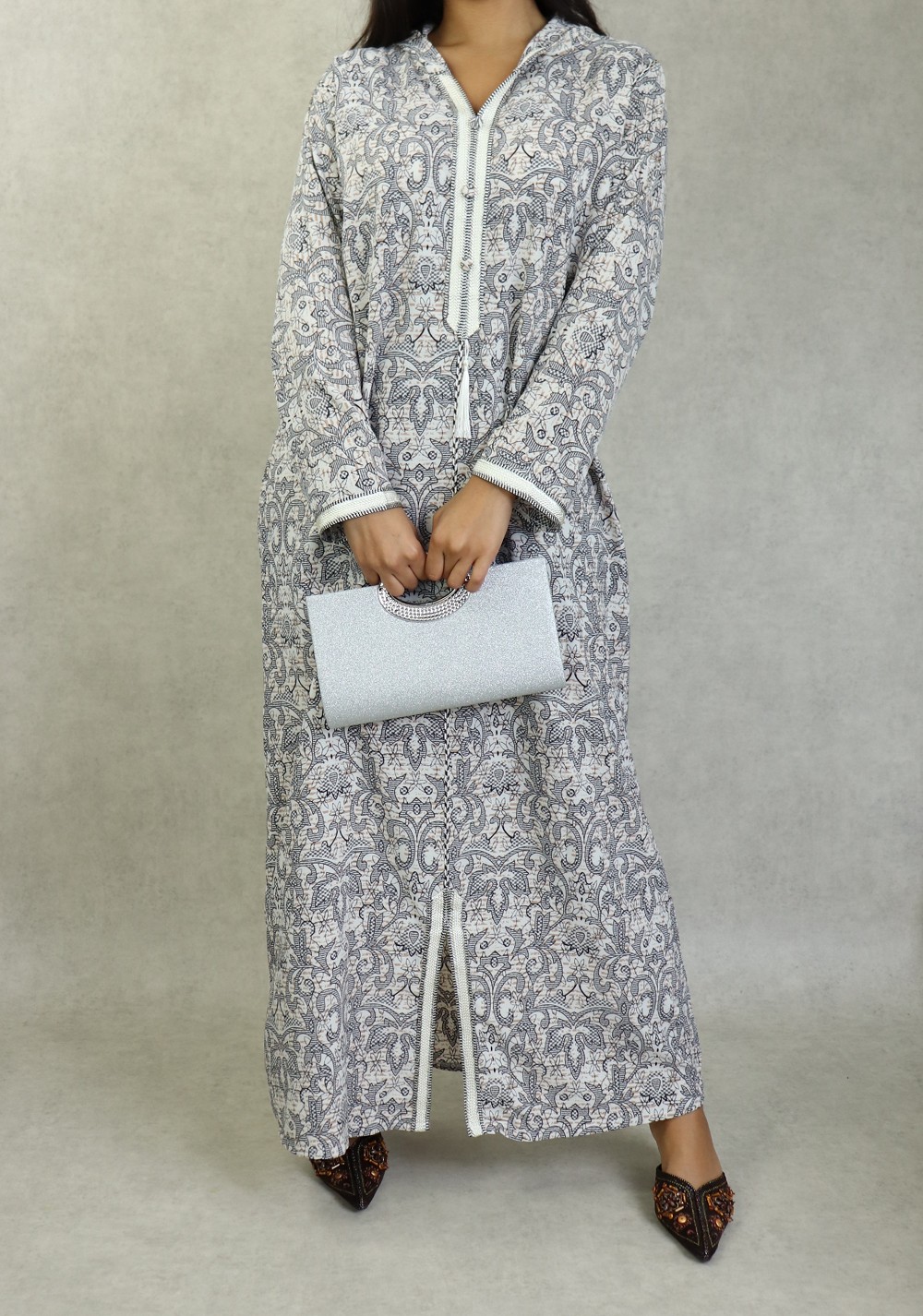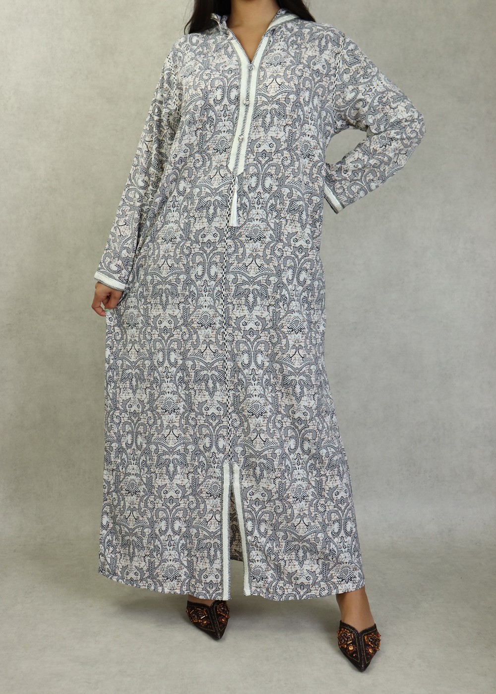 Robe fluide style djellaba marocaine avec capuche motifs fleurie Noir sur un fond couleur beige