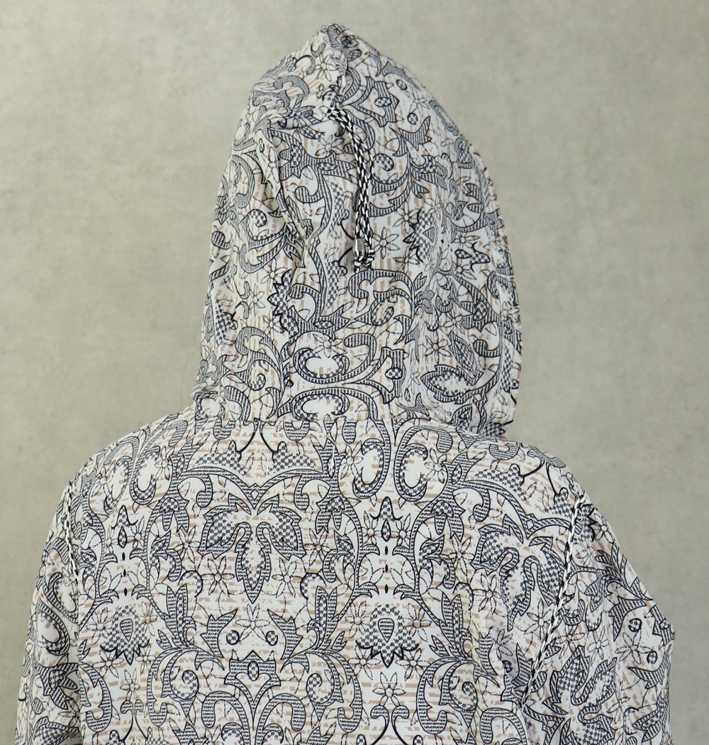 Robe fluide style djellaba marocaine avec capuche motifs fleurie Noir sur un fond couleur beige Vetement & Accessoire
