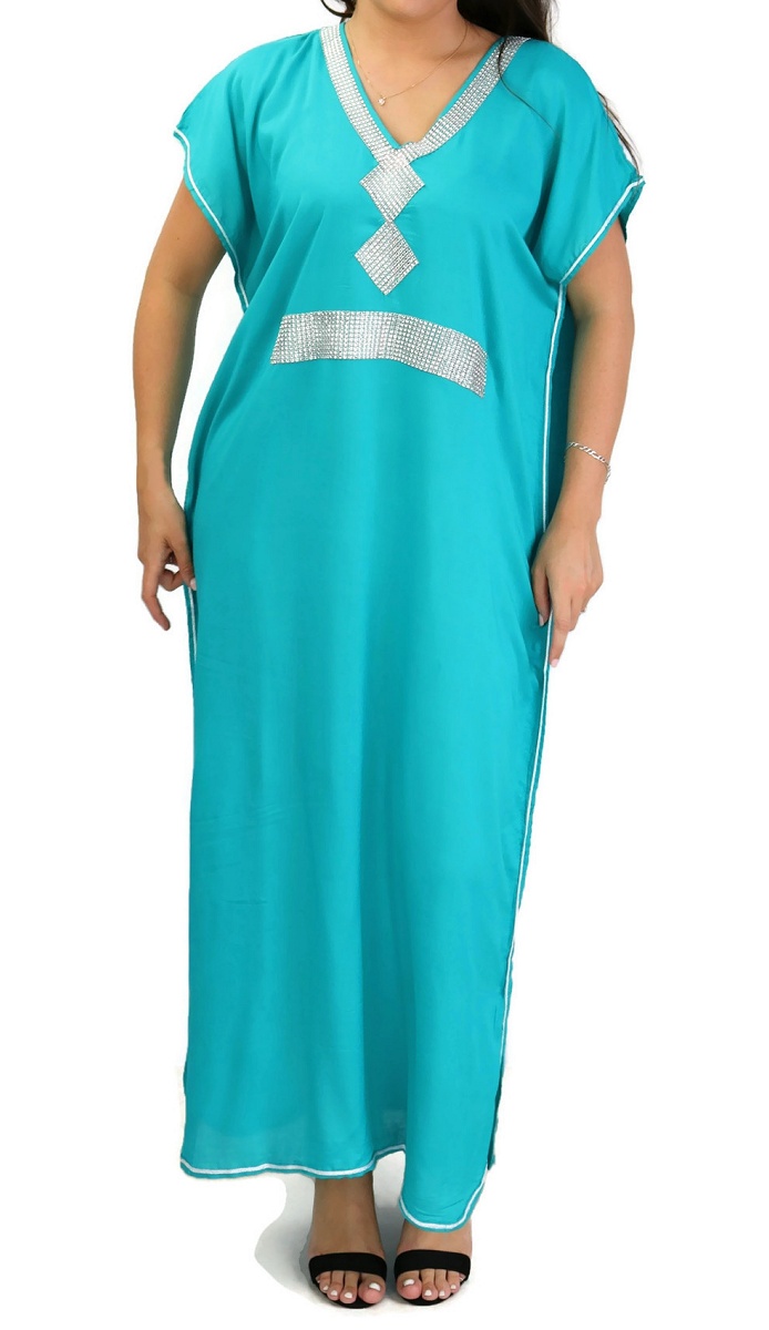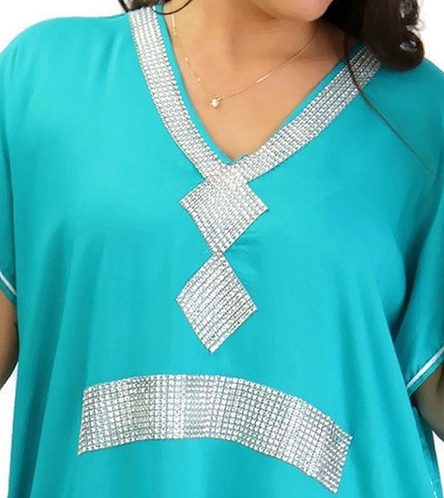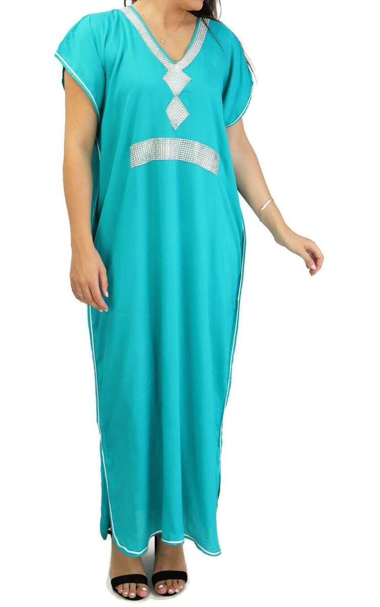 Belle gandoura traditionnelle marocaine, coupe droite col en V avec strass ainsi sur que la taille, ceinture à l'intérieur si on désire un effet cintré.