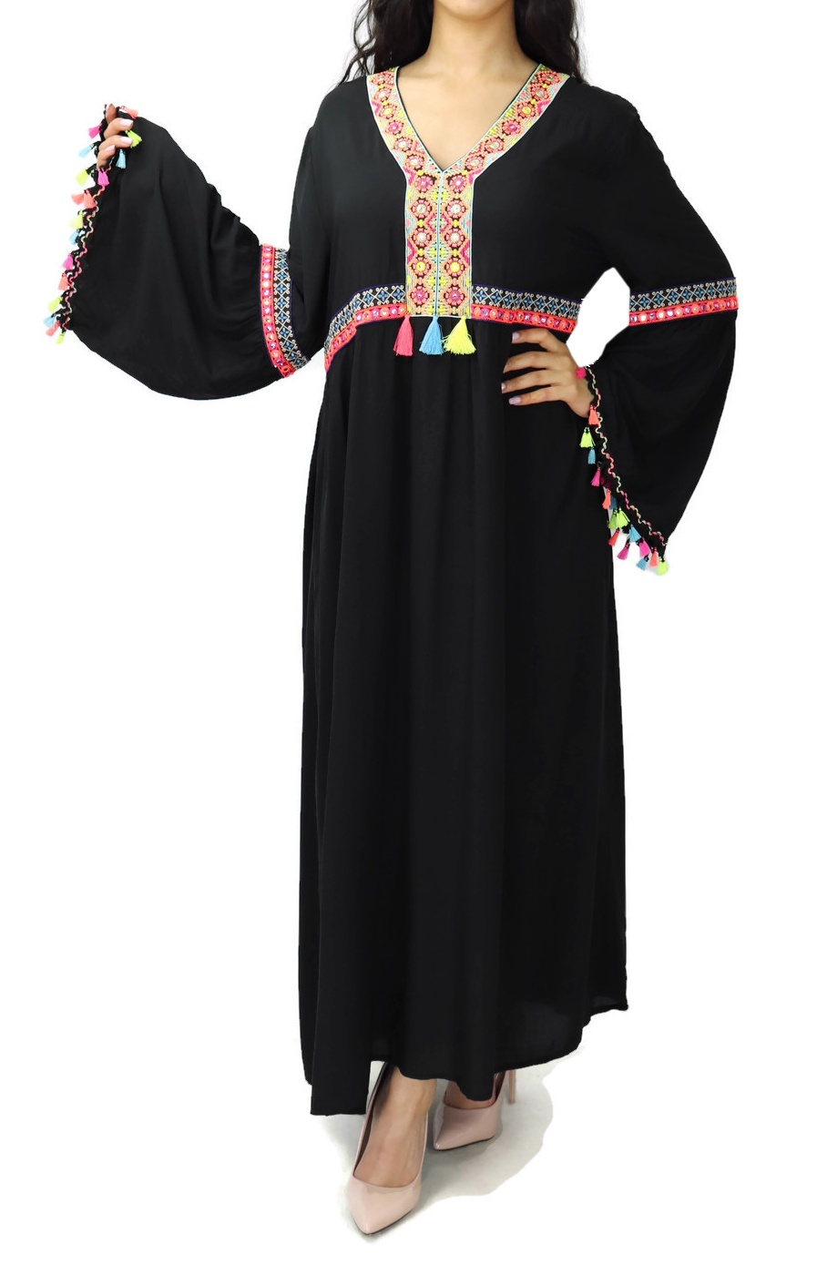 On est tombé sous le charme de cette robe unie en coton, simplement rehaussée de broderies colorées devant. Sa coupe large vous offre un confort total. Avec ses décorations multicolores en forme de pompons, elle fera votre contentement.