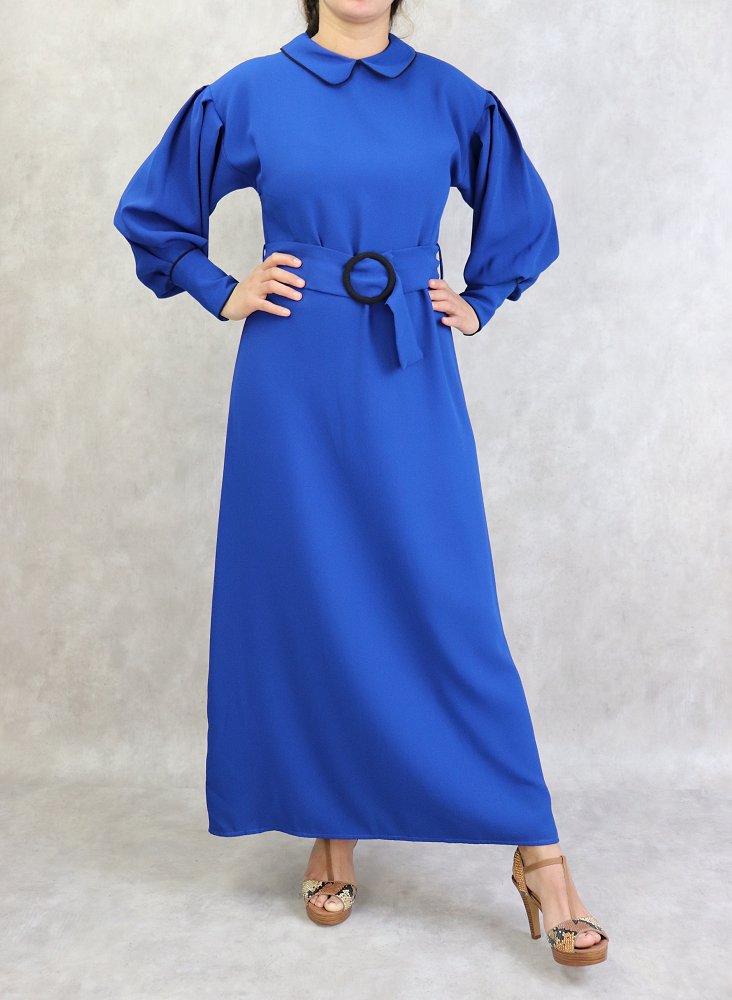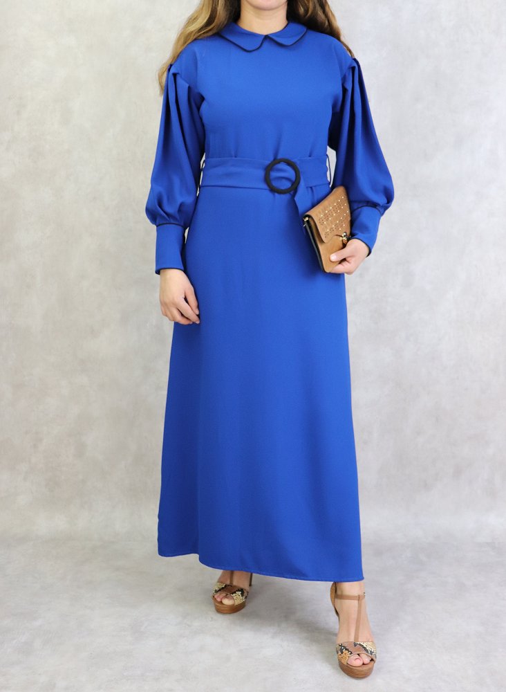 Cette robe est parfaite. Réalisée dans un tissu fluide, col claudine, fermeture éclair au dos, manches longues bouffante, une fantaisie de boutons aux poignets, taille resserrée par une ceinture coulissante. Boucle effet écaille.