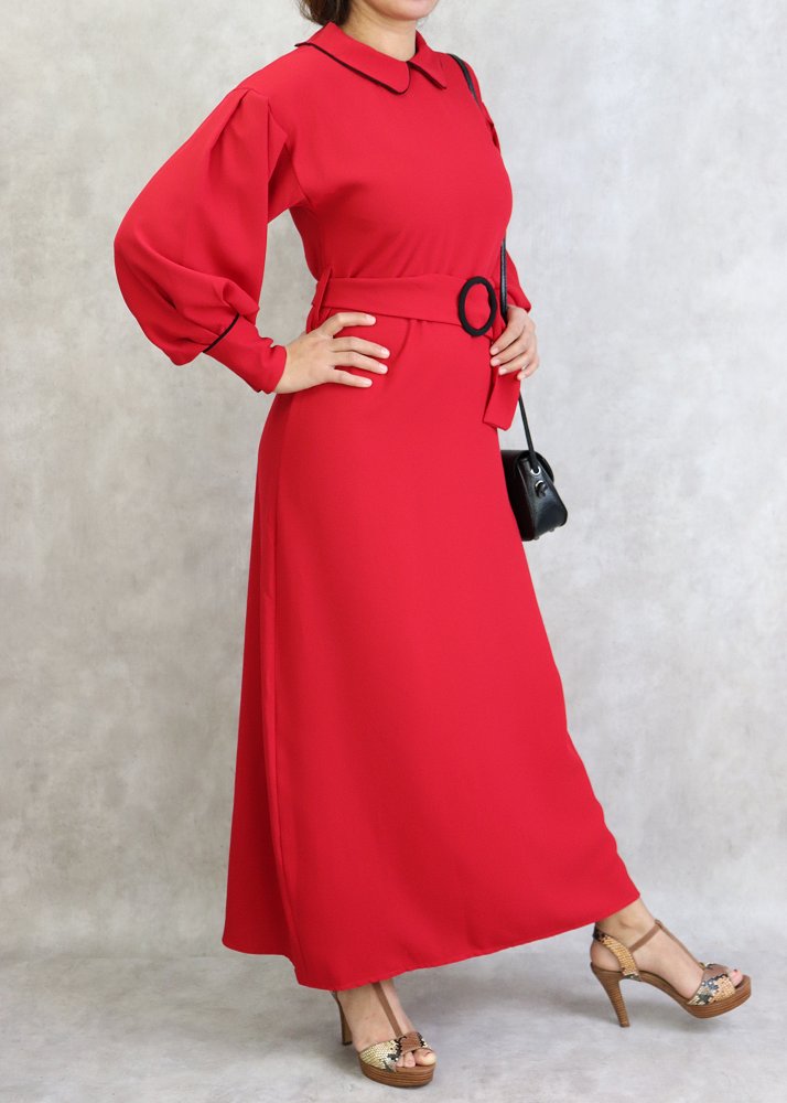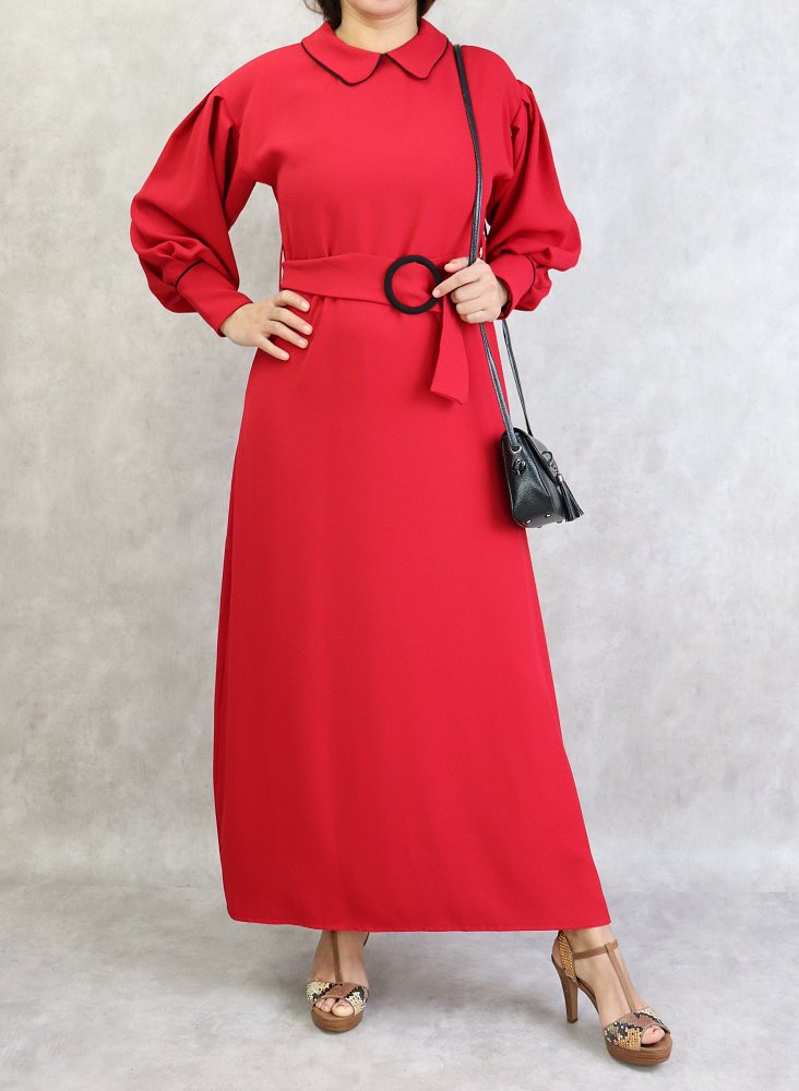 Cette robe est parfaite. Réalisée dans un tissu fluide, col claudine, fermeture éclair au dos, manches longues bouffante, une fantaisie de boutons aux poignets, taille resserrée par une ceinture coulissante. Boucle effet écaille.