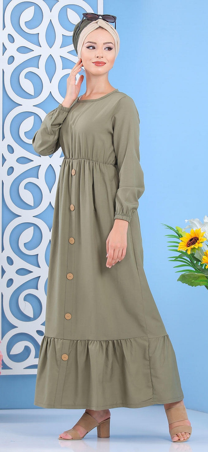 Robe longue, col arrondi, manches finition élastiques aux poignets, taille cintrée par un élastique, effet volant sur la partie basse. Sobre et élégant, ce modèle est adapté pour être porté quotidiennement, il sera encore plus mis en valeur avec quelques accessoires.