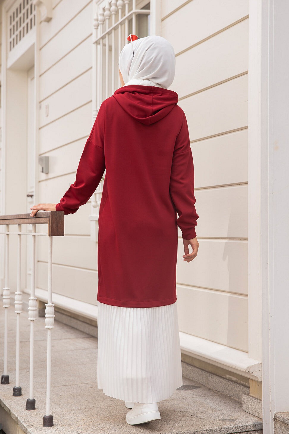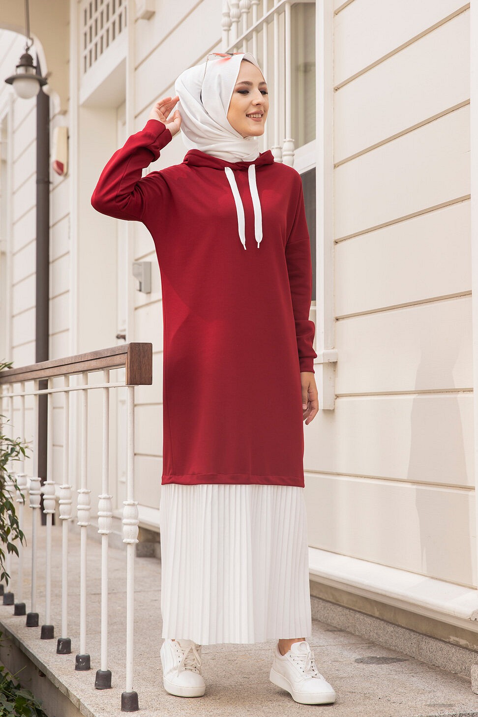 Robe longue à capuche effet plissée pour femme musulmane - Couleur bordeaux et blanc Vetement & Accessoire
